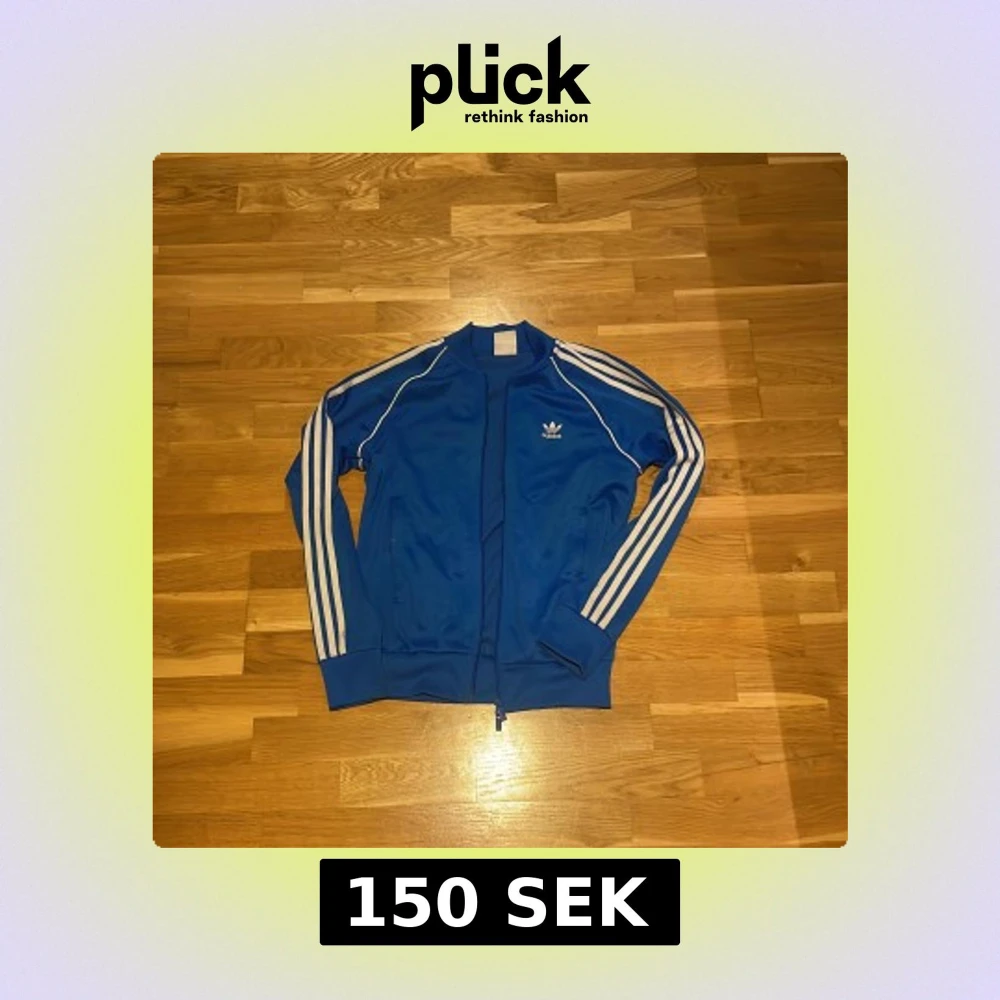 Säljer en klassisk blå Adidas tröja med vita ränder längs ärmarna och Adidas-logga på bröstet. Jackan har dragkedja framtill, ribbade muddar och långärmad design.