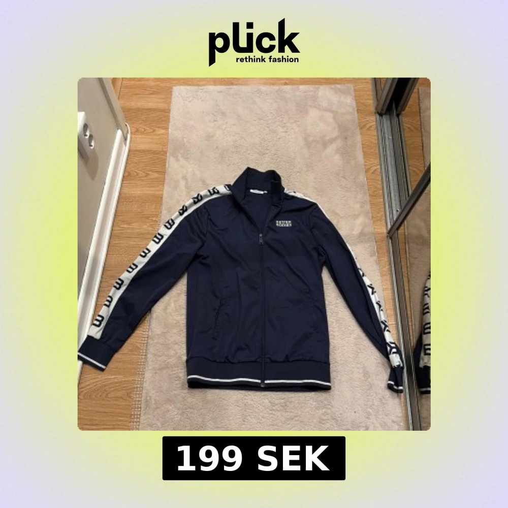 Snygg marinblå vindjacka från Better Bodies med vita detaljer och logga längs ärmarna. Jackan har dragkedja framtill, ribbade muddar och krage. Perfekt för dig som gillar sportig stil och vill ha något bekvämt och trendigt. Jackan har använts väldigt lite då den är förliten för mig. Den är i storlek Small för män, skriv vid funderingar