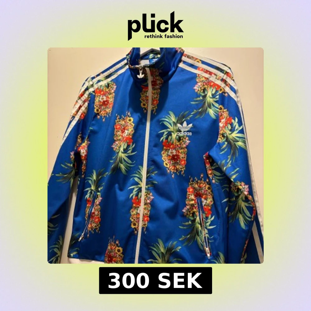 Säljer en cool blå jacka från Adidas med ett färgglatt blommönster och de klassiska tre ränderna längs ärmarna. Jackan har dragkedja och två fickor framtill. Perfekt för att sticka ut i mängden! 🌺