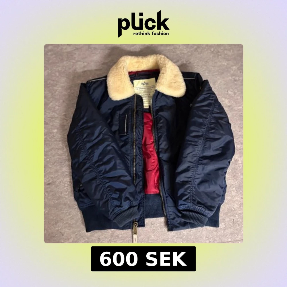Säljer en snygg blå bomberjacka från Alpha Industries med en mysig pälsliknande krage. Jackan har en quiltad röd insida och dragkedja framtill. Perfekt för kyligare dagar! Size M men passar också S, skick 10/10