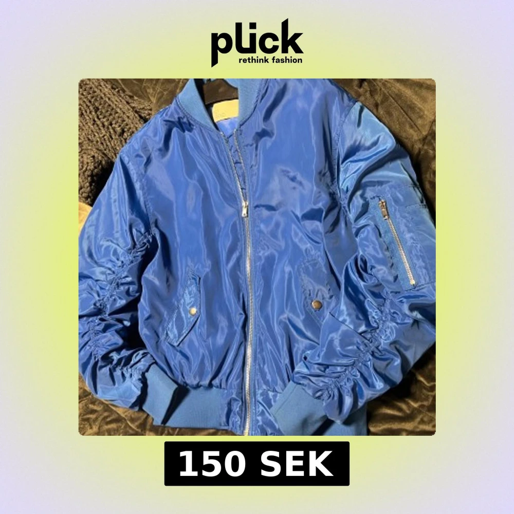 Snygg blå bomberjacka med dragkedja och fickor med knappar. Sitter lite oversized på mig (storlek S) vilket är jag personligen tycker är supersnyggt.