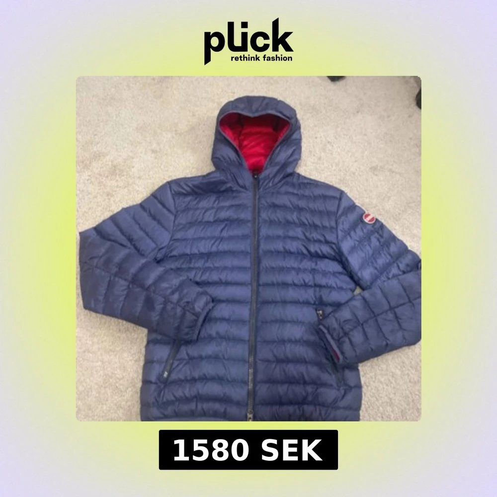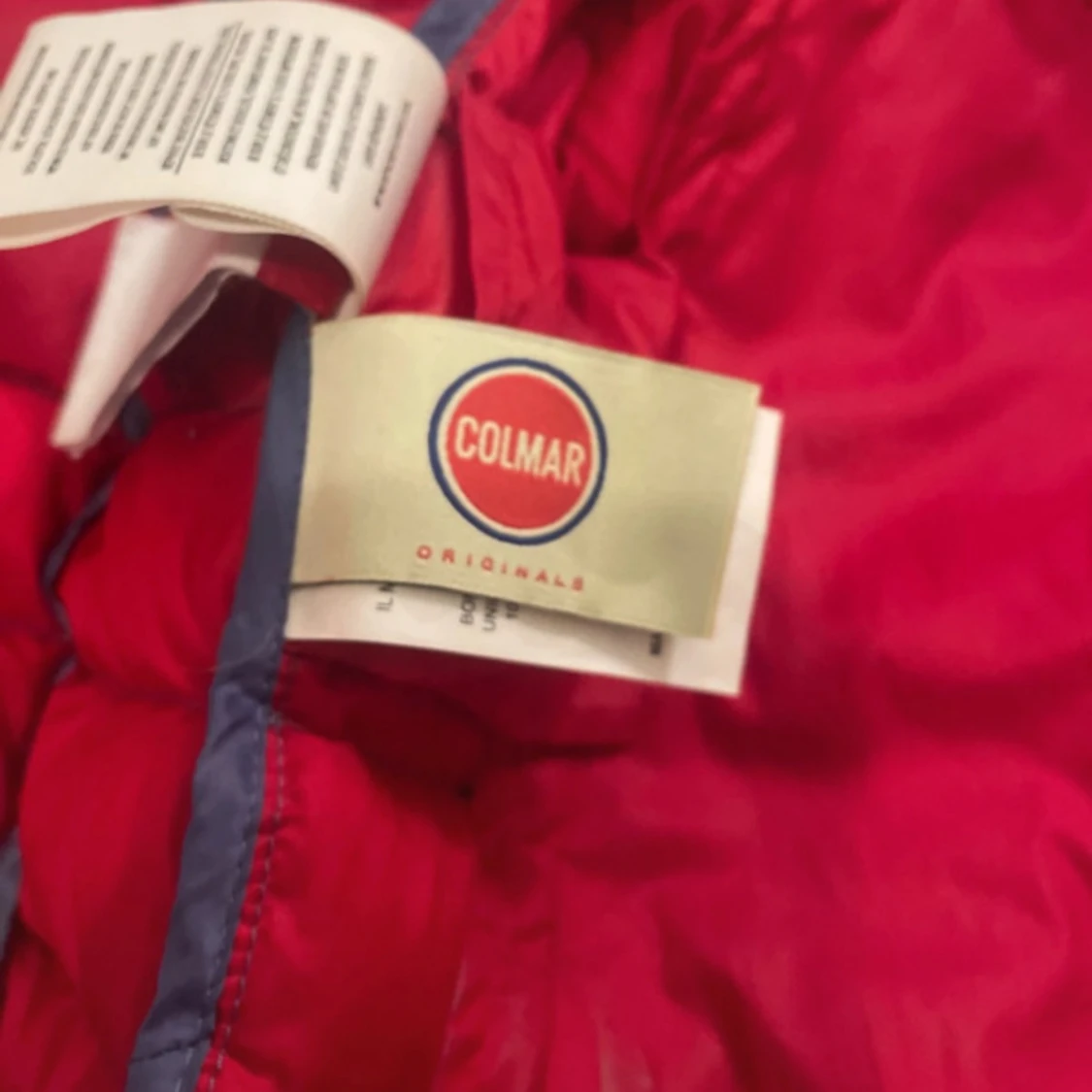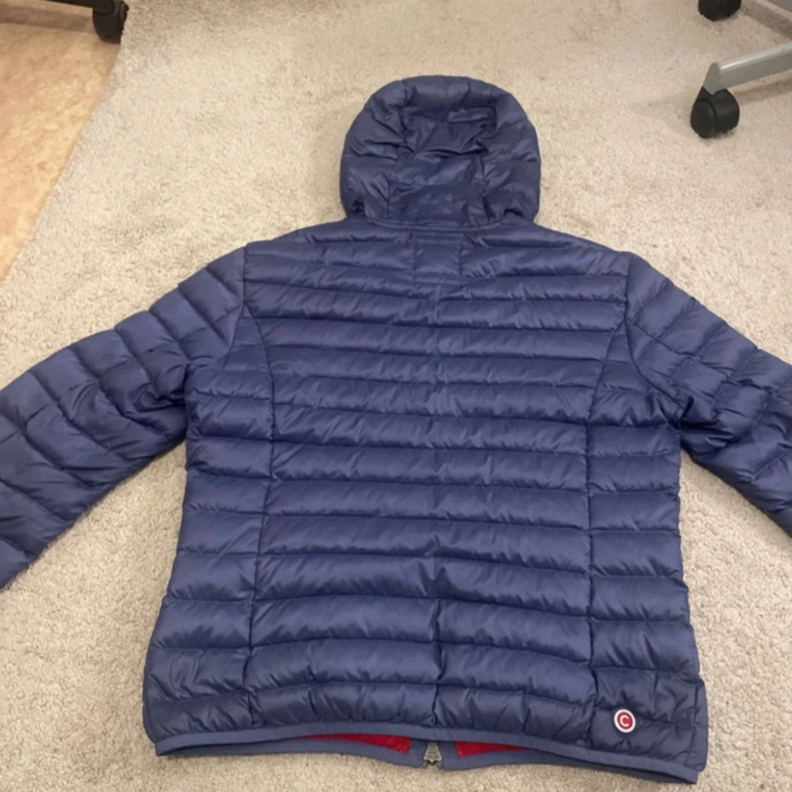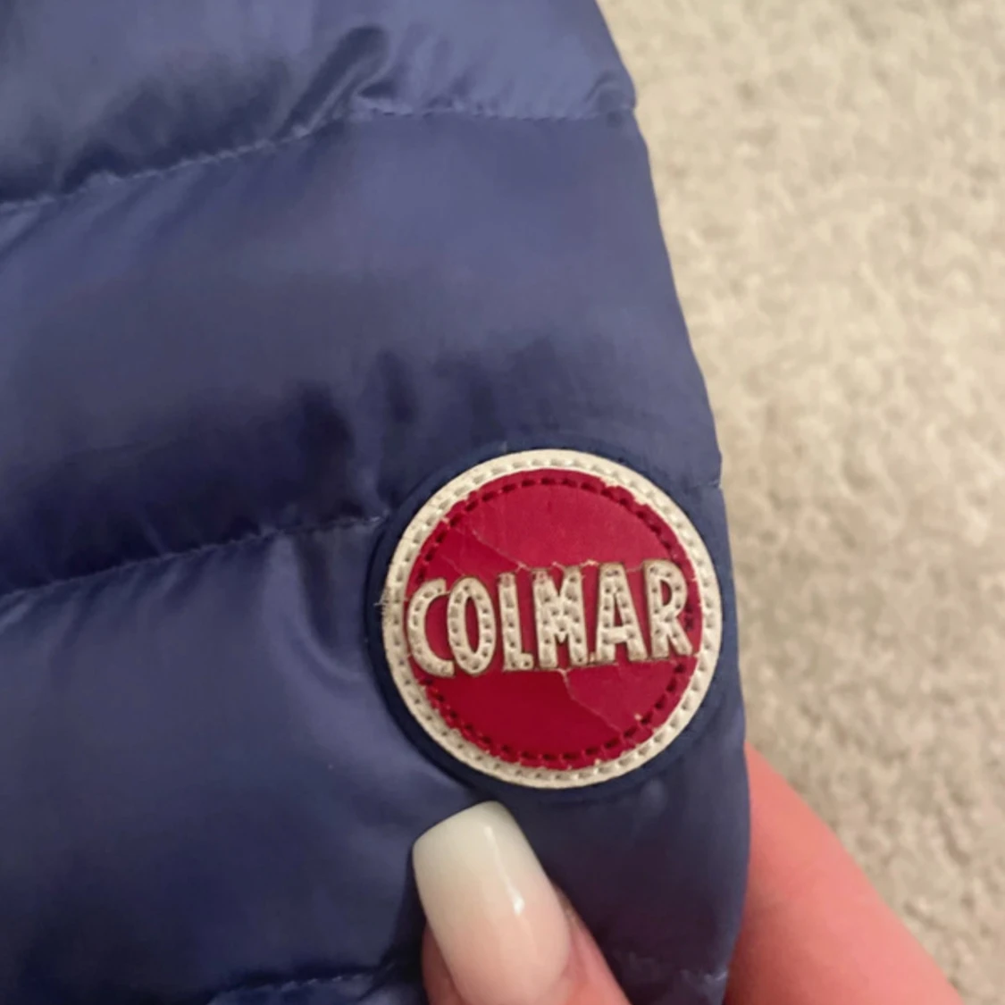 Säljer en blå dunjacka från Colmar med röd insida och huva. Jackan har quiltad design, dragkedja framtill och två fickor med dragkedja. Märkeslogga på ärmen och insidan. Perfekt för kalla dagar och riktigt snygg passform. Storleken är 50 enligt colmar, men passar xs/s