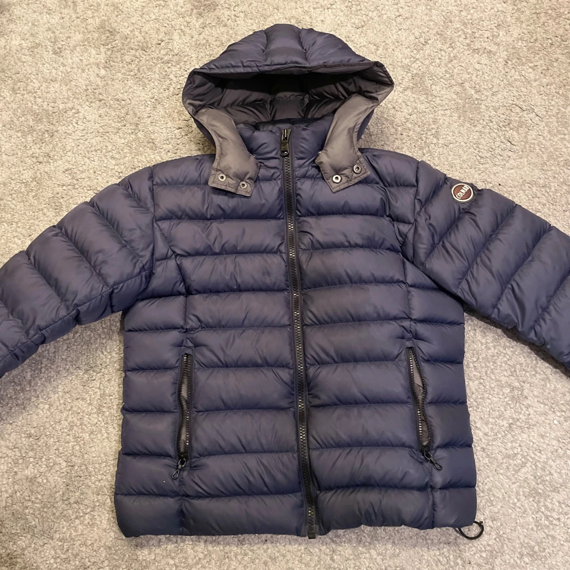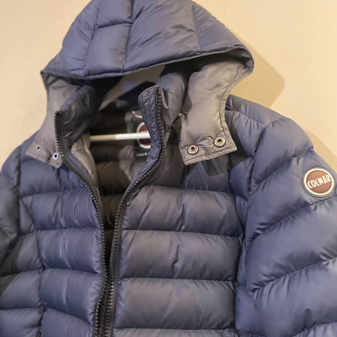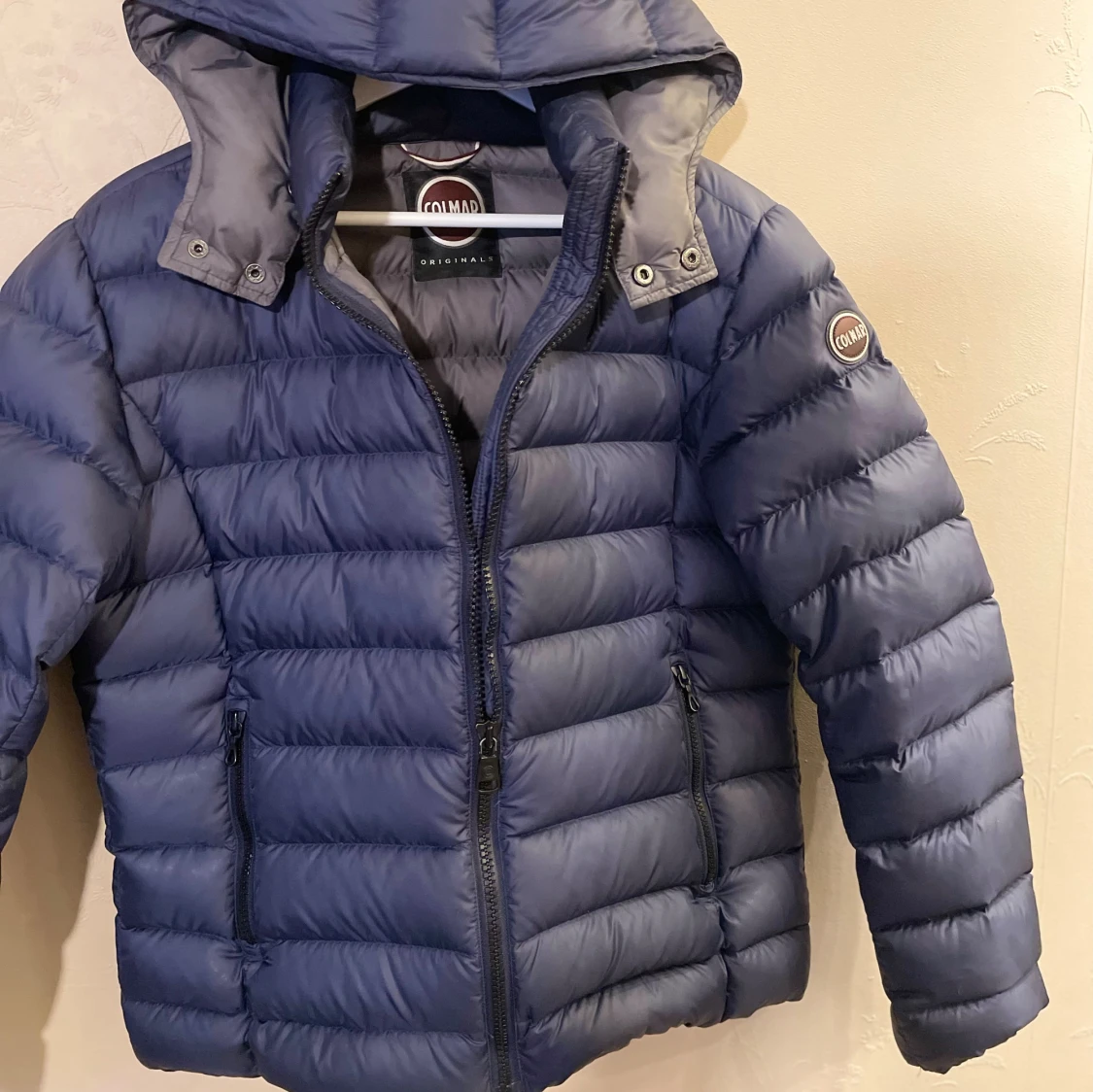 Säljer en blå pufferjacka från Colmar med huva och dragkedja framtill. Jackan har två sidofickor med dragkedja och ett Colmar-märke på ärmen. Fodret är mörkgrått och jackan har en snygg, quiltad design som ger en cool look.