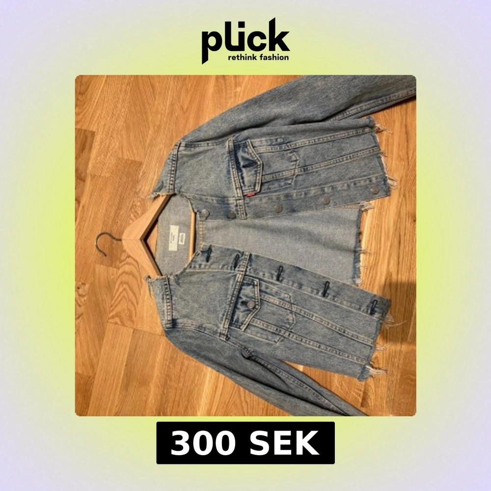Säljer en blå croppad jeansjacka från Levi's med råa kanter och klassiska bröstfickor. Jackan har knappar framtill och långa ärmar. Perfekt för dig som gillar en trendig och avslappnad stil.