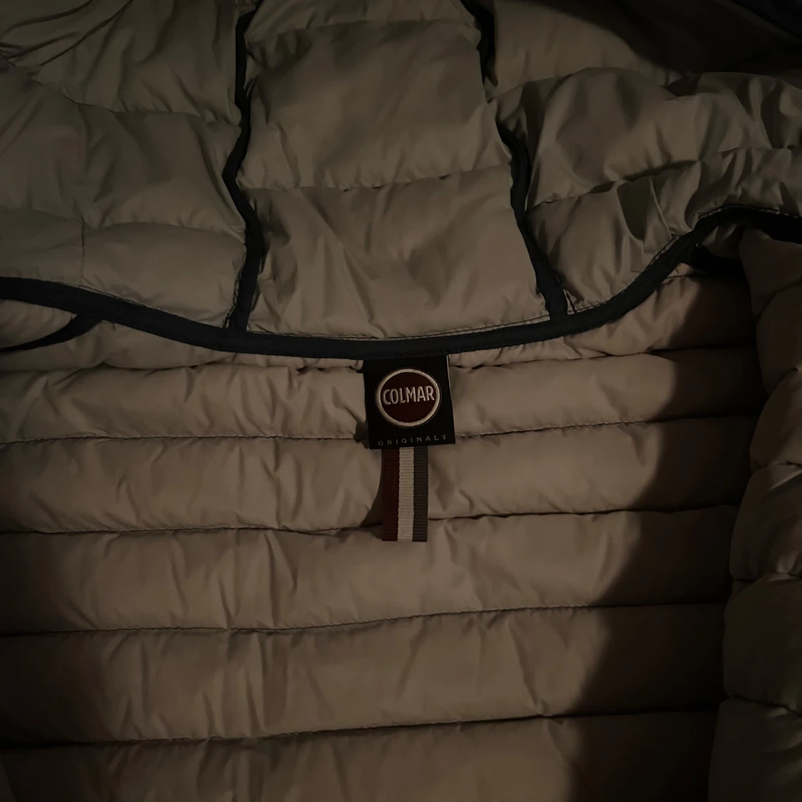 Säljer en blå dunjacka från Colmar med huva och dragkedja framtill. Jackan har två sidofickor med dragkedja och quiltad design. Perfekt för kyliga dagar och riktigt snygg passform. Märke på ärmen och innerfoder i ljus färg.