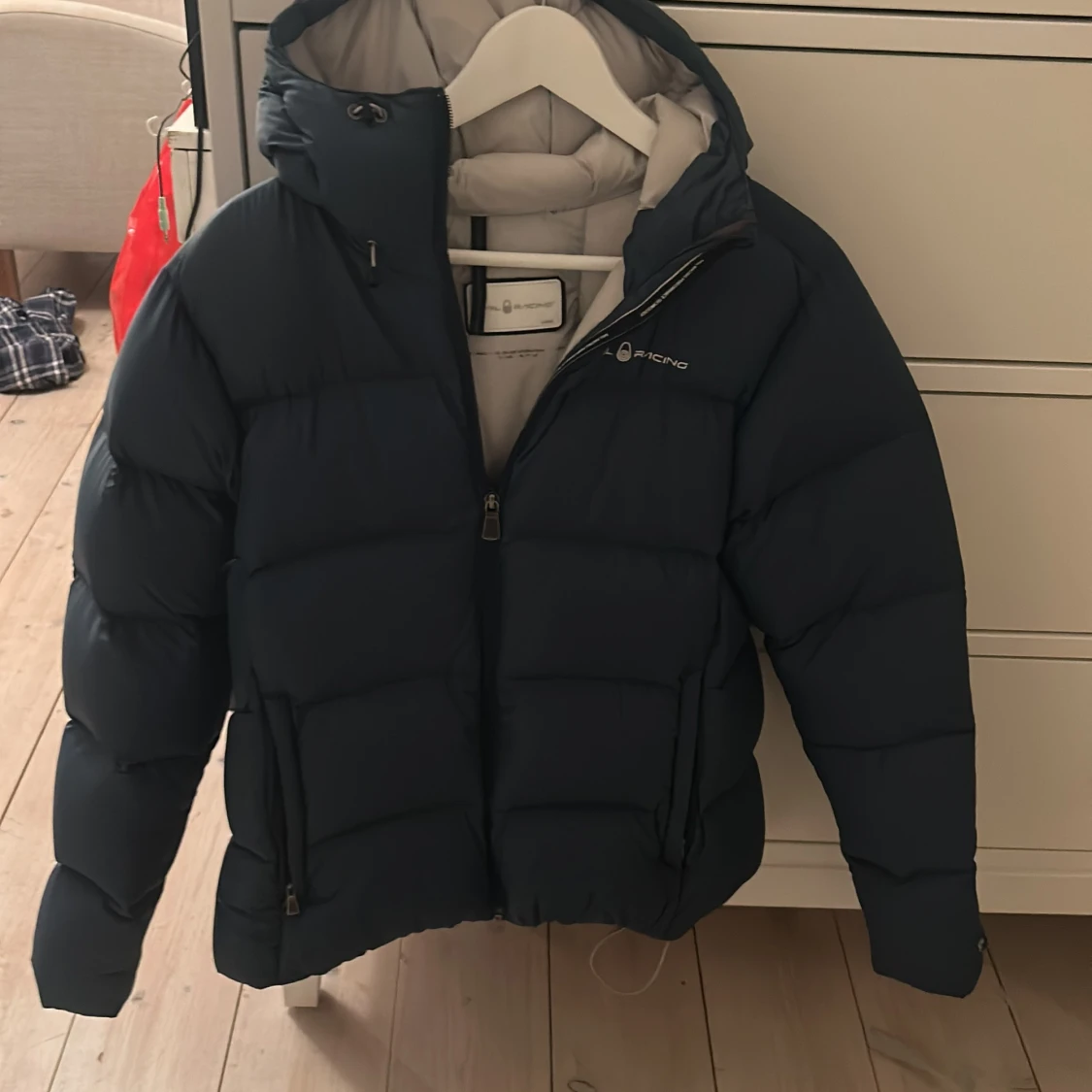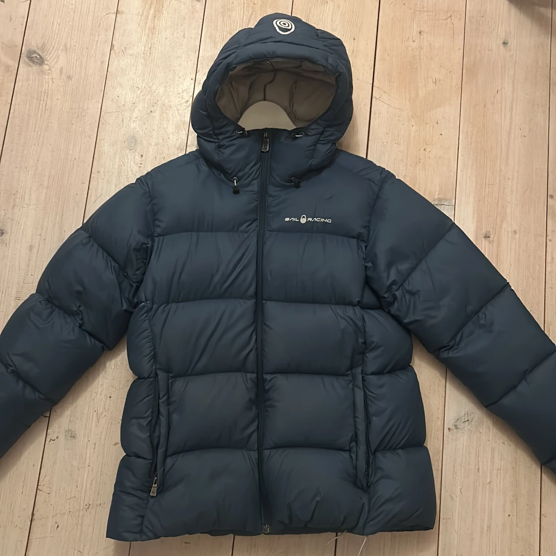Säljer en blå dunjacka från Sail Racing i storlek large. Jackan har en dragkedja framtill och är långärmad med en mysig huva. Tyvärr har den en liten repa men går att lämna in eller sy ihop själv.