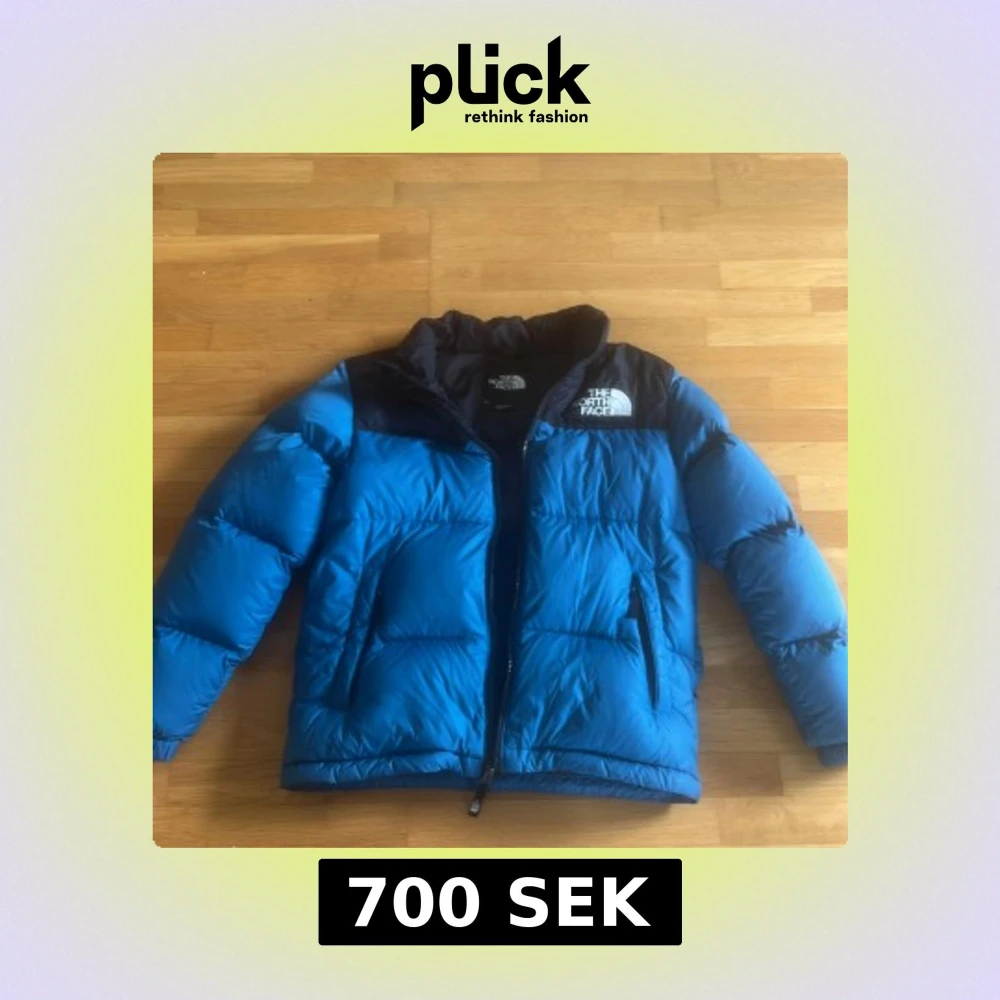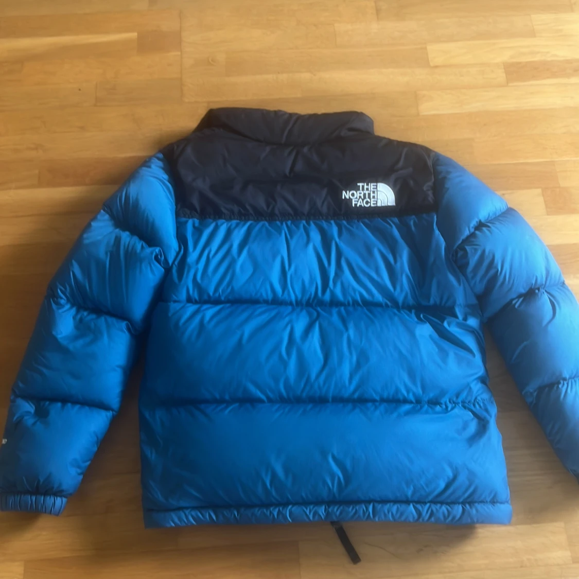 Säljer en blå och svart dunjacka från The North Face med klassisk logga på bröstet och ryggen. Jackan har hög krage, dragkedja framtill och två fickor med dragkedja. Perfekt för kalla dagar och riktigt snygg streetstil.