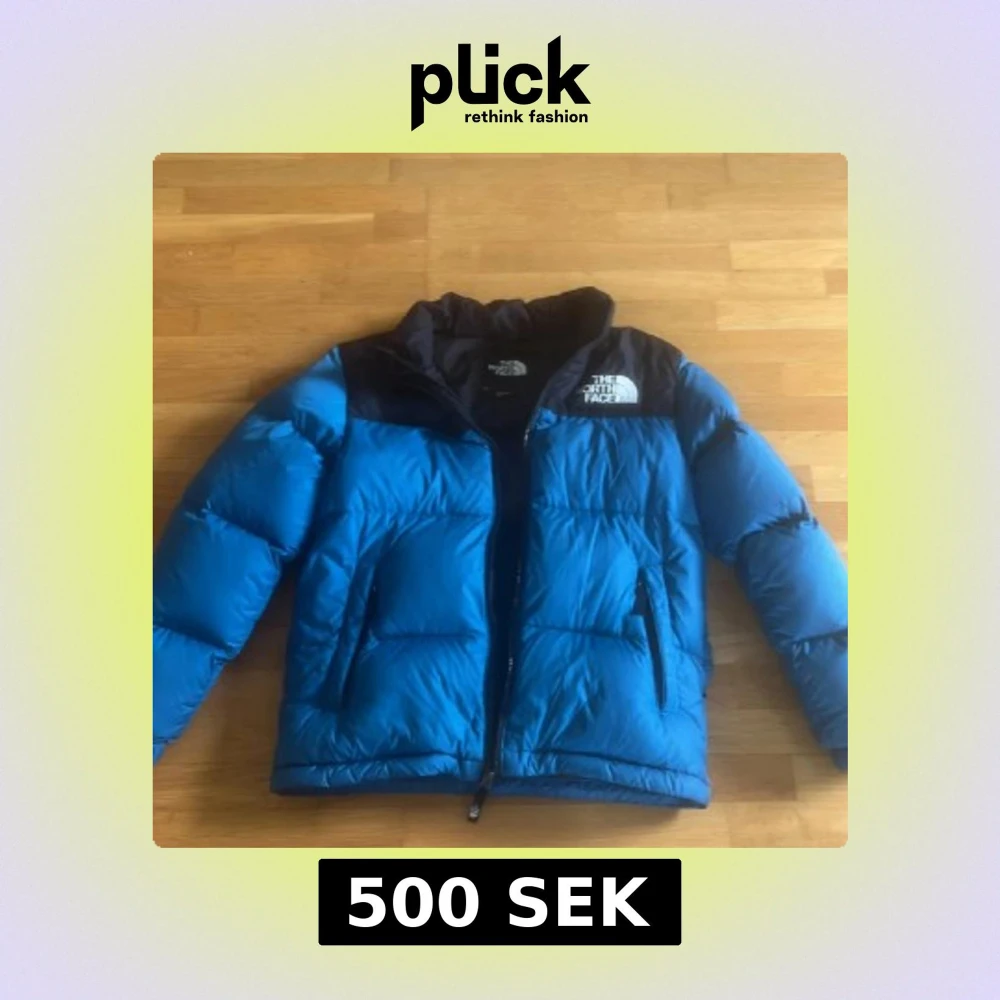 Säljer en blå dunjacka från The North Face med svart axelparti och logga på bröstet. Jackan har dragkedja framtill, två sidofickor och en hög krage. Perfekt för kalla dagar och har en cool, puffig look som är riktigt trendig. Säljer då den tyvärr är för liten..