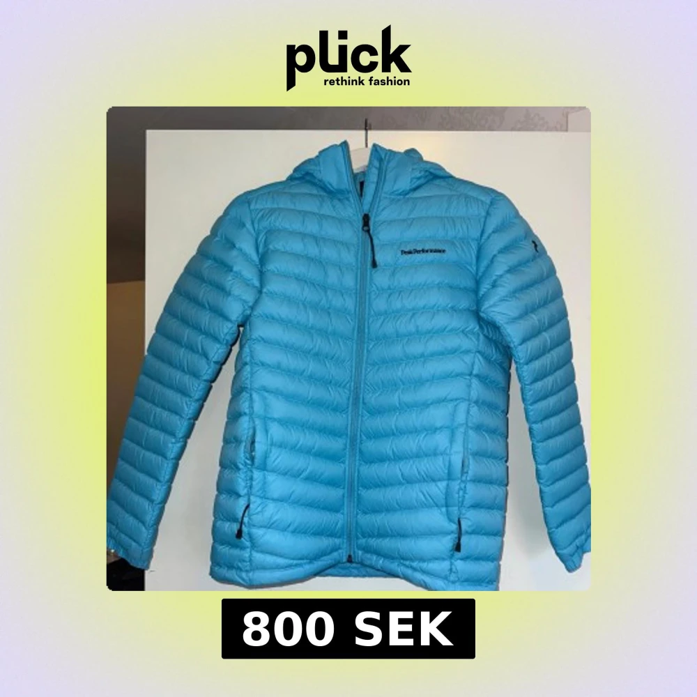 Snygg blå dunjacka från Peak Performance med huva och dragkedja framtill. Jackan har quiltad design, två fickor med dragkedja och broderad logga på bröstet. Perfekt för kyliga dagar. Storlek 170