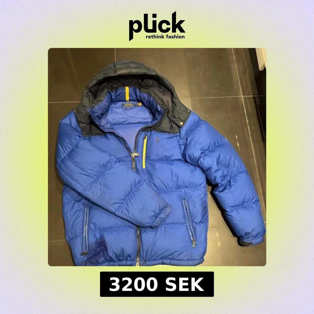 Blå dunjacka från Polo Ralph Lauren med mörkgrå detaljer på axlar och huva. Jackan har flera dragkedjeförsedda fickor, gul detalj vid kragen och är fodrad med dun och polyester. Perfekt för kalla dagar och har en sportig vibe. OBS jackan har även en liten lagning på höger arm kan skicka bild bara att skriva! Priset är ej hugget i sten.