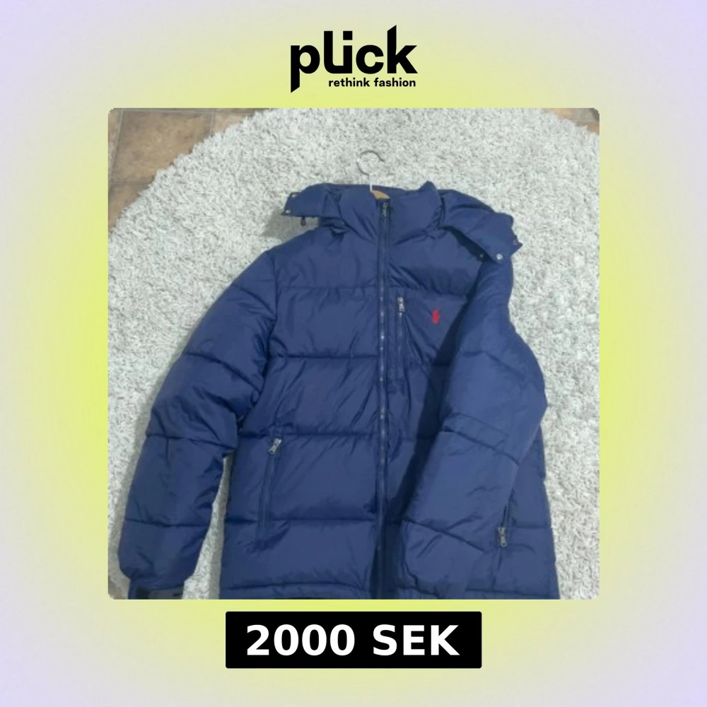 Säljer en marinblå dunjacka från Polo Ralph Lauren med röd broderad logga på bröstet. Jackan har hög krage, dragkedja framtill och flera fickor med dragkedja. Perfekt för kalla dagar och riktigt snygg streetstil.
