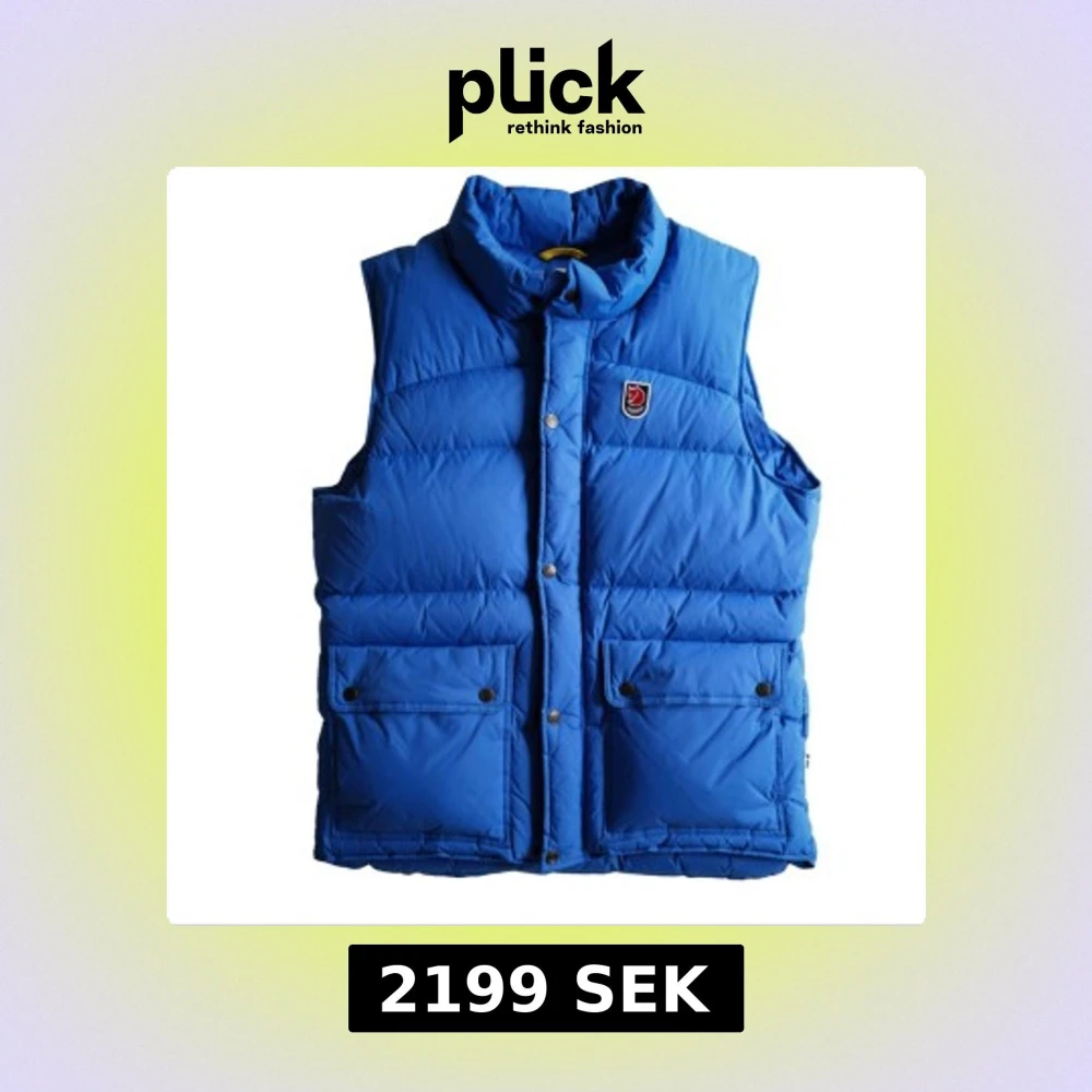 Säljer denna blå dunväst från Fjällräven med hög krage och två stora fickor framtill. Västen har tryckknappar och klassisk Fjällräven-logga på bröstet. Perfekt att slänga över en hoodie för extra värme.