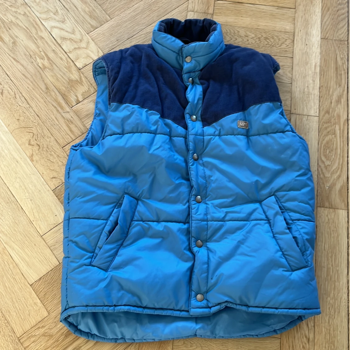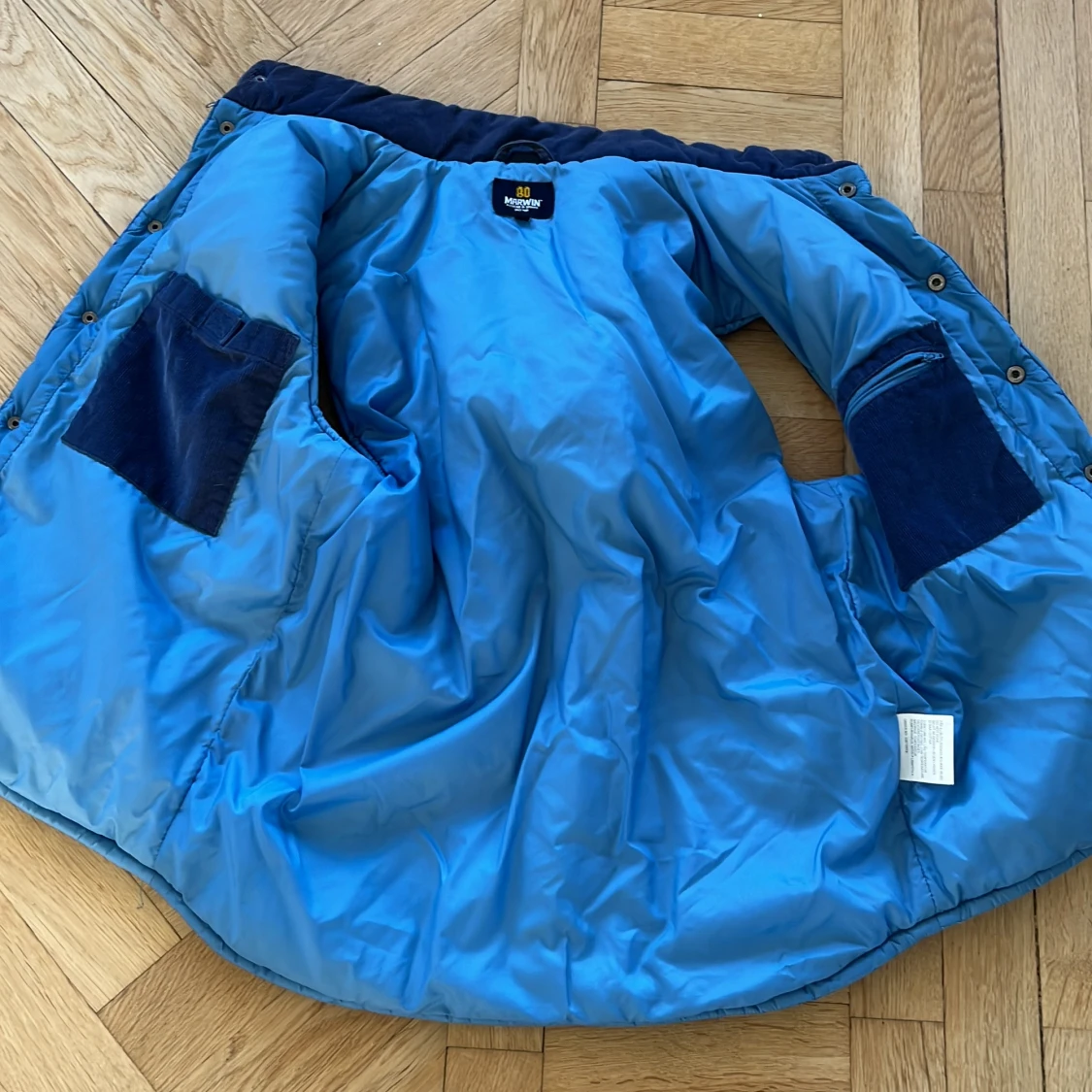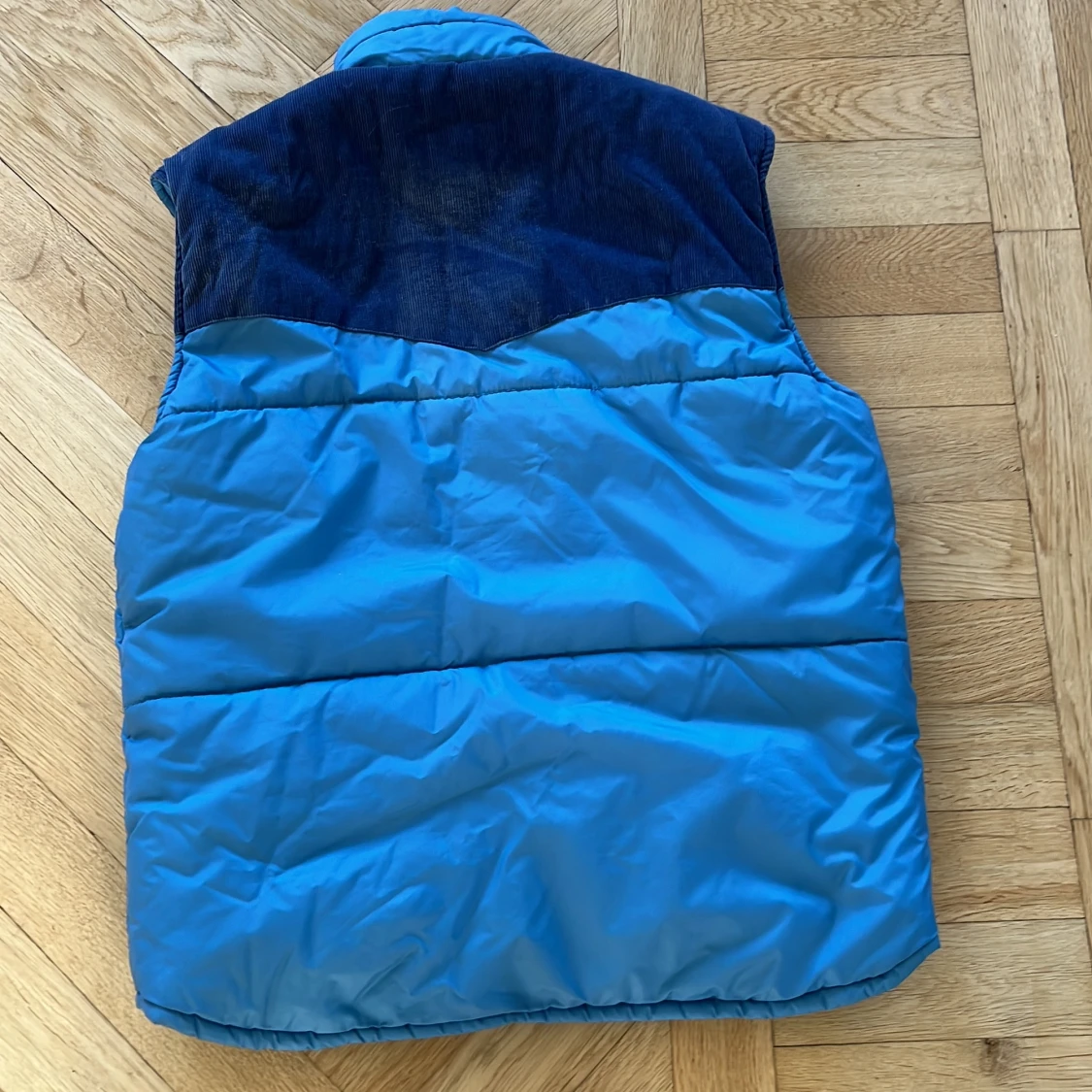 Säljer en blå dunväst från Marwin med mörkare axelparti och krage. Västen har knappar framtill och två fickor. Perfekt för kyligare dagar. Pris kan diskuteras