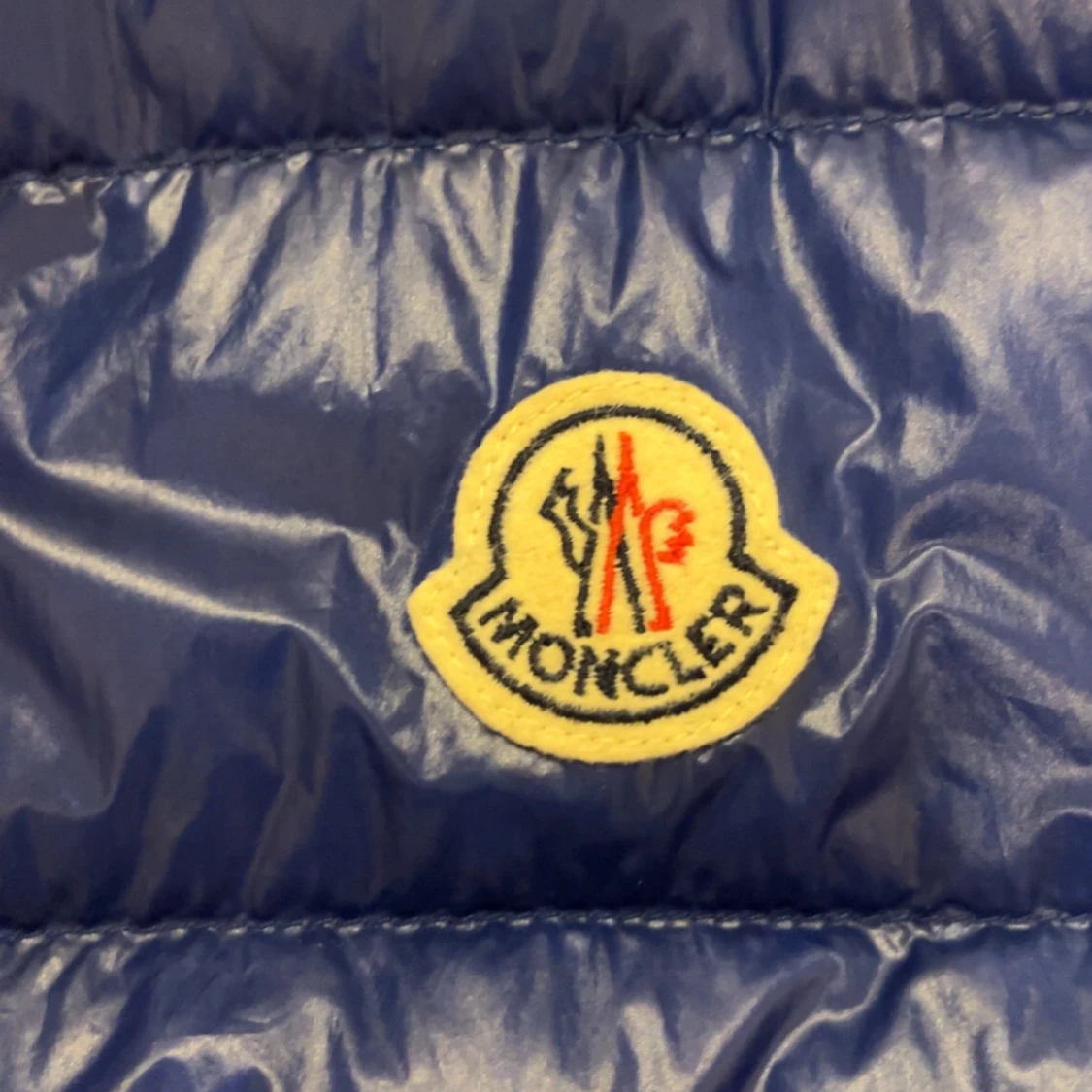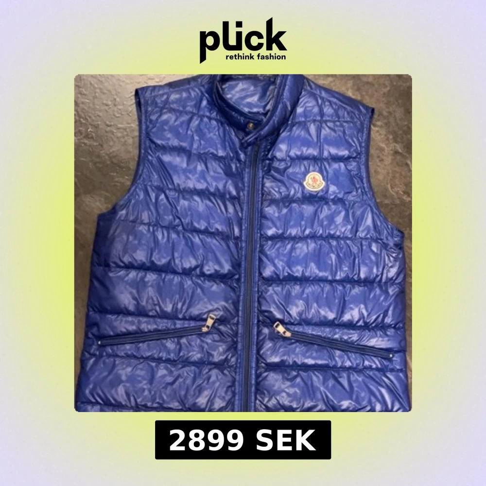 Snygg blå dunväst från Moncler med glansig finish och klassisk logga på bröstet. Västen har hög krage, två fickor med dragkedja och quiltad design. Perfekt för lager-på-lager och streetstyle.
