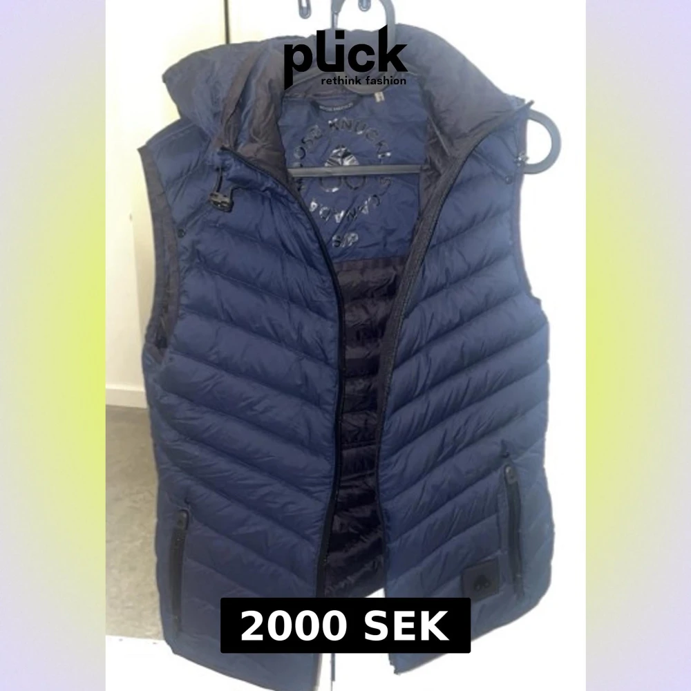 Snygg marinblå dunväst från Moose Knuckles med quiltad design och dragkedja framtill. Västen har två praktiska fickor med dragkedja och en hög krage som ger extra värme. Perfekt att slänga över en hoodie för en cool look.