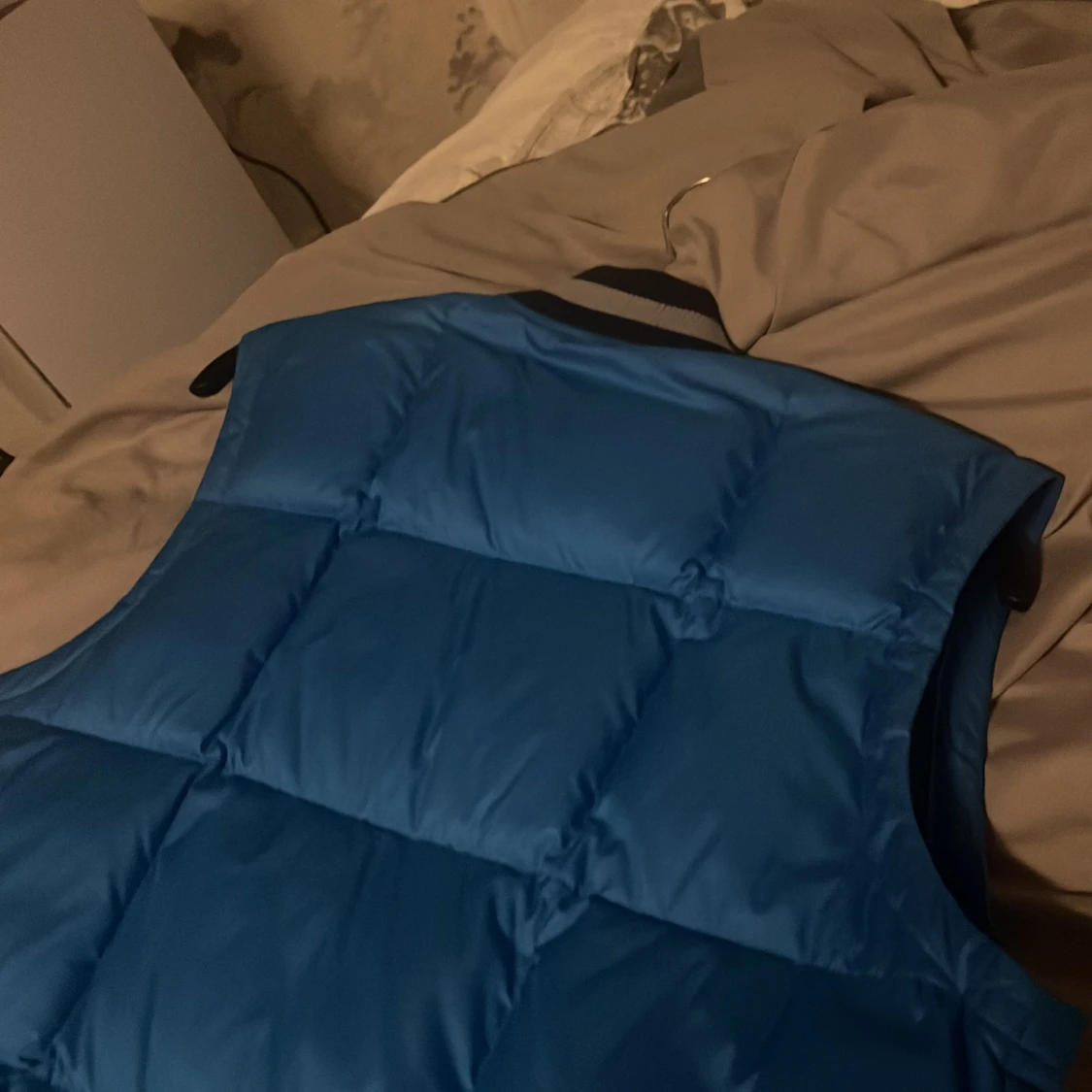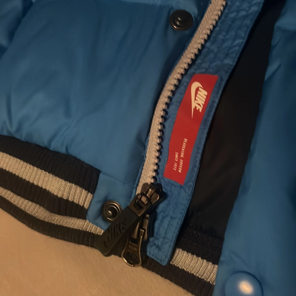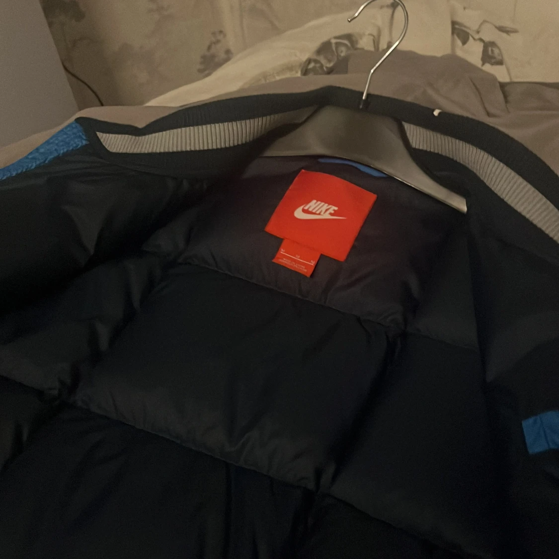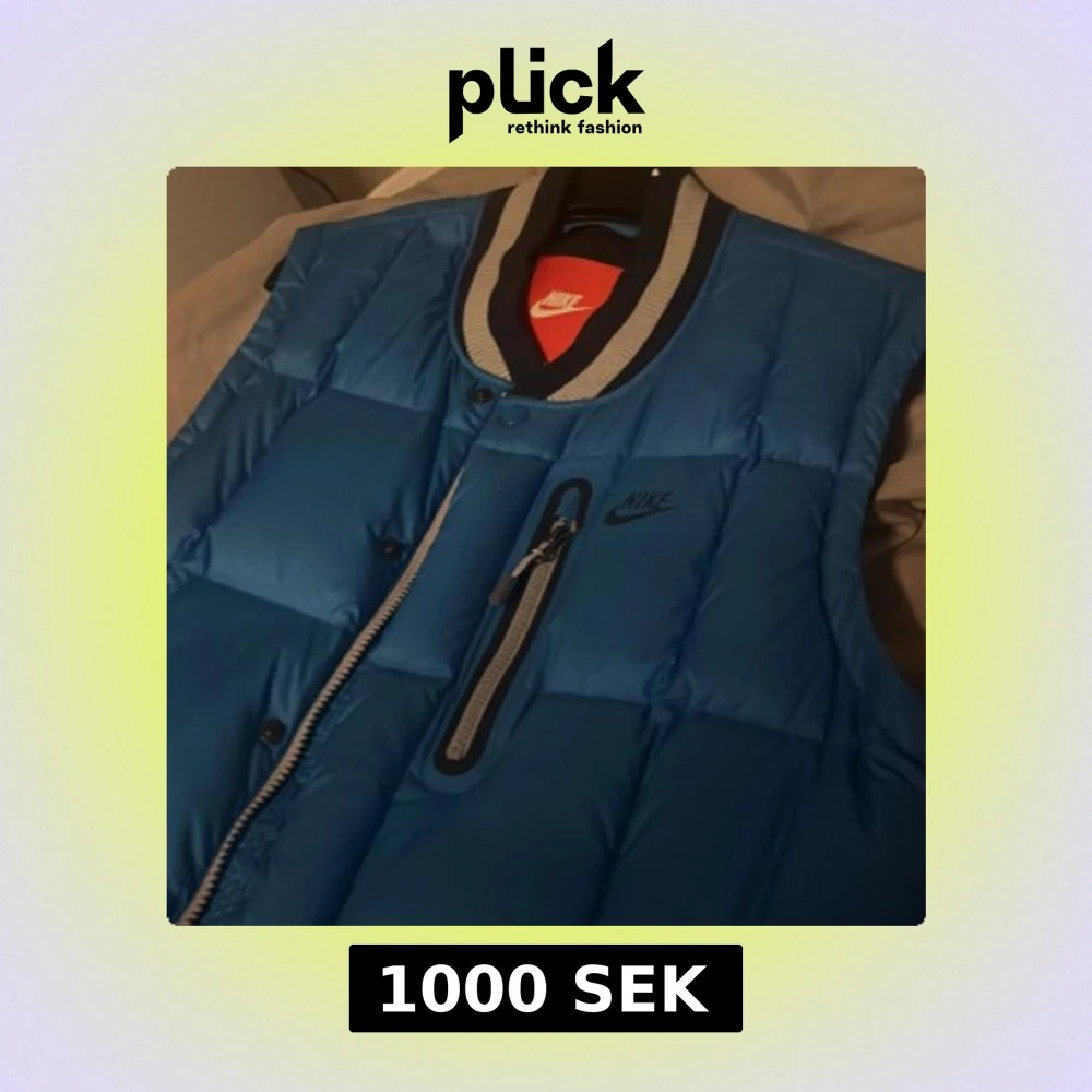 Helt ny oanvänd snygg blå dunväst från Nike med svart logga på bröstet. Västen har quiltad design, dragkedja och knappar framtill samt en randig ribbad krage i svart och grått. Praktisk bröstficka med dragkedja och sportig look. Perfekt för lager-på-lager under kyliga dagar. Priset går att diskutera 🤝
