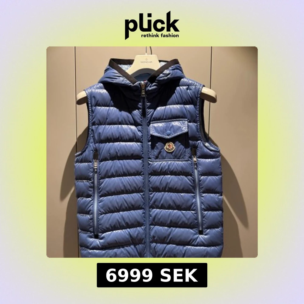 Snygg blå dunväst från Moncler med quiltad design och huva. Västen har dragkedja framtill, två sidofickor med dragkedja och en bröstficka med knapp och Moncler-logga. Kvitto finns, hör av dig för mer info
