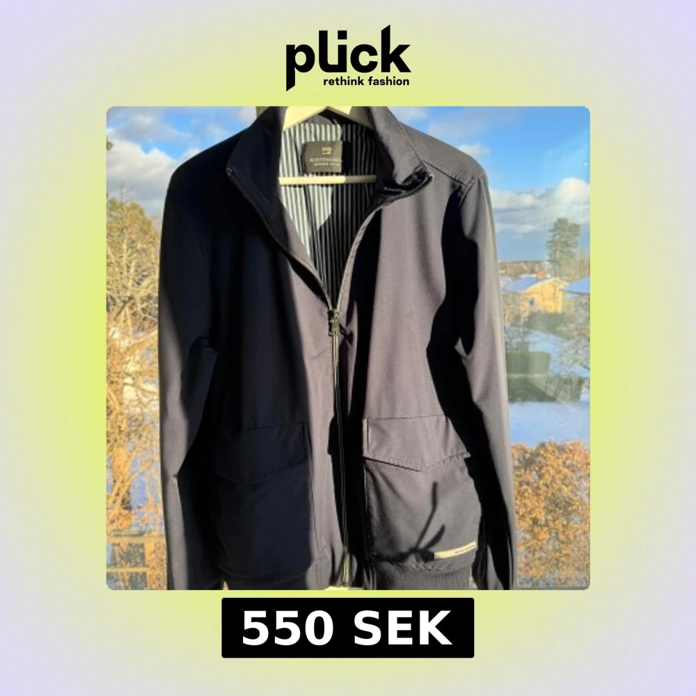 Snygg blå jacka från Scotch & Soda med dragkedja och två stora fickor framtill. Insidan har ett stilrent randigt mönster i vitt och blått. Perfekt för en casual look.