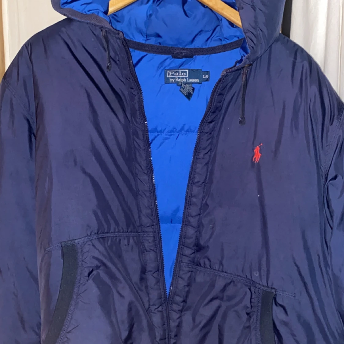 Säljer en snygg blå vindjacka från Polo Ralph Lauren i storlek L. Jackan har en dragkedja framtill och är perfekt för höst och vår. Den är tillverkad i polyester och har en klassisk design med huva. Perfekt för dig som vill ha en stilren och funktionell jacka! 💙