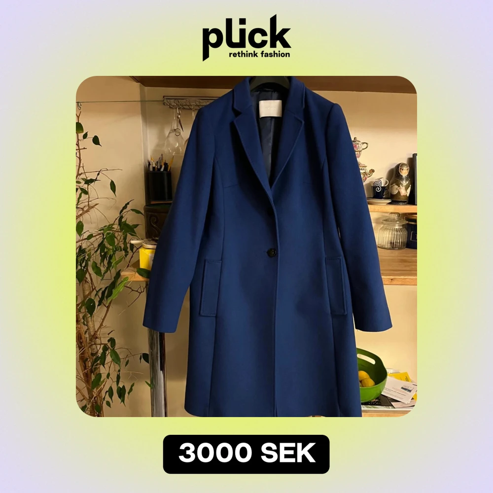 Säljer en elegant blå kappa i ullblandning. Den har en klassisk design med en enkel knapp framtill och långa ärmar. Perfekt för höst och vinter, och ger en stilren look till vilken outfit som helst. Passar både till vardags och festliga tillfällen.