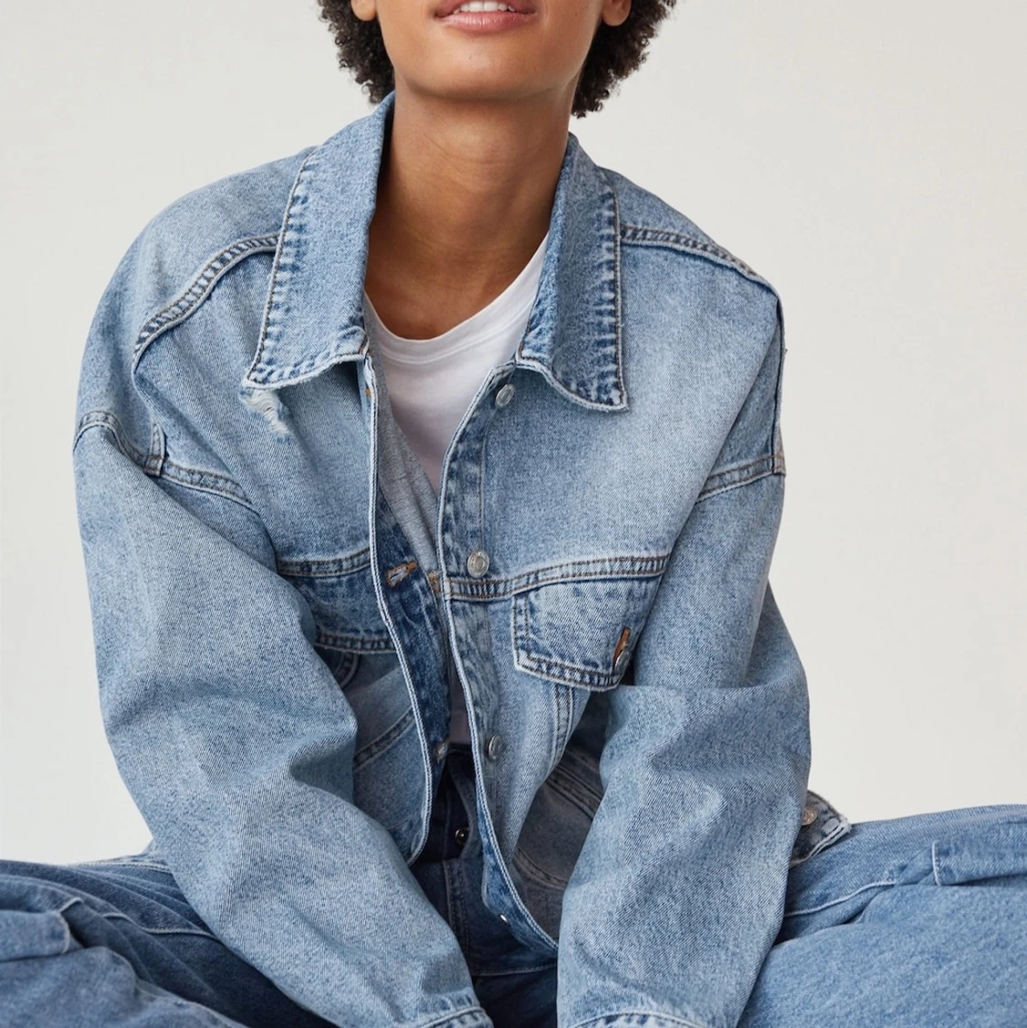 En jeansjacka från Mango i oversize-modell🤍 Den är i storlek M men sitter bra på mig som har storlek S. Den är använd ca 2 gånger så den är ju som ny. Köparen står för frakten🤍