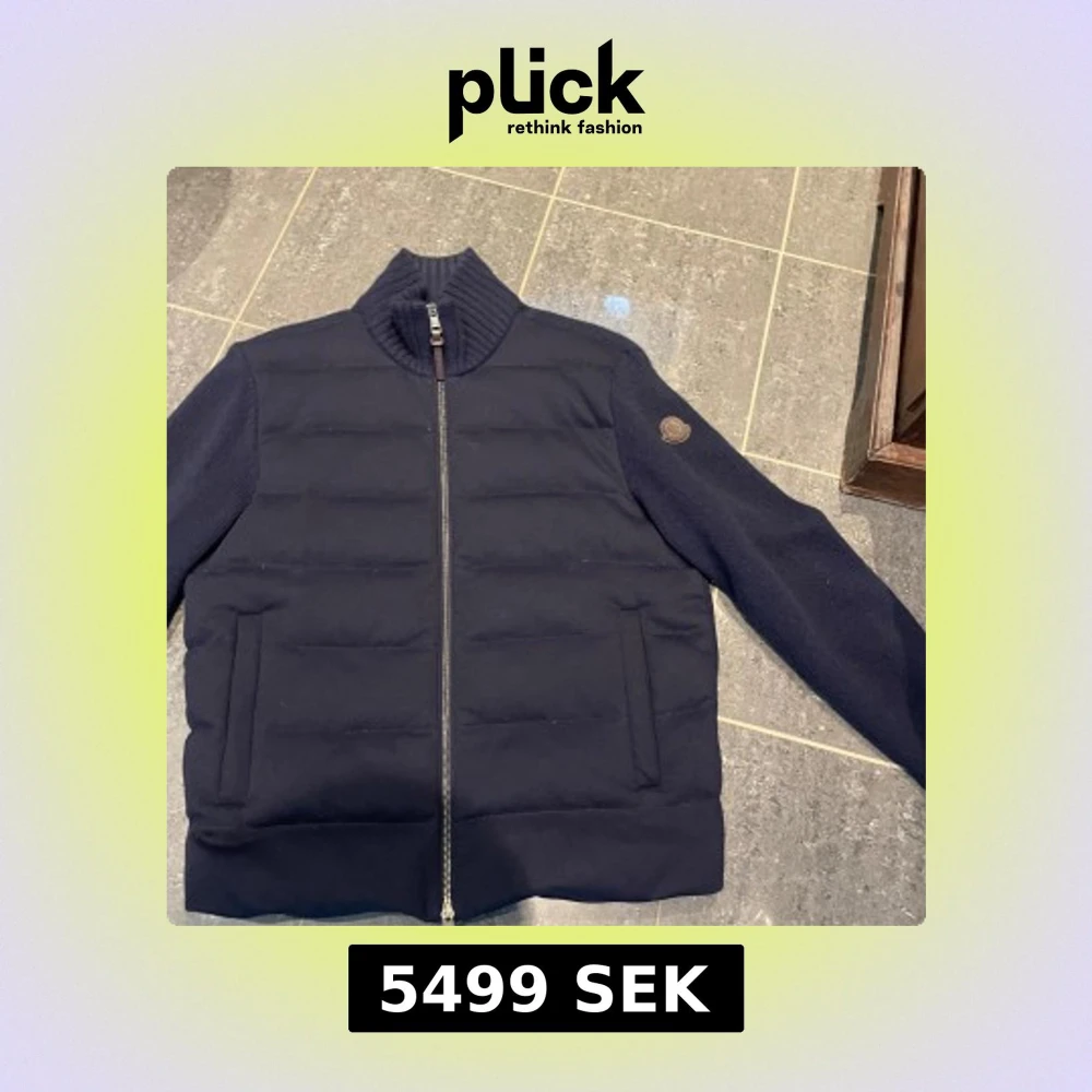 Snygg mörkblå cardigan från Moncler med quiltad front och stickade ärmar. Jackan har hög ribbad krage, dragkedja med läderdetalj och Moncler-logga på ärmen. Bra skick och väldigt fin jacka. Även äkta!