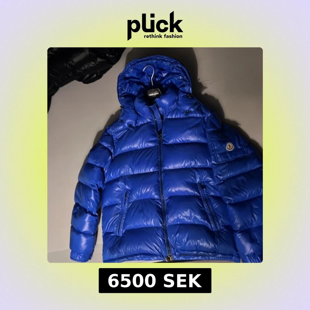 Säljer en blå Moncler Maya pufferjacka med glansig finish och ikonisk logga på ärmen. Jackan har huva, dragkedja framtill och flera fickor. Perfekt för kalla dagar när du vill sticka ut med en riktigt fet vinterjac