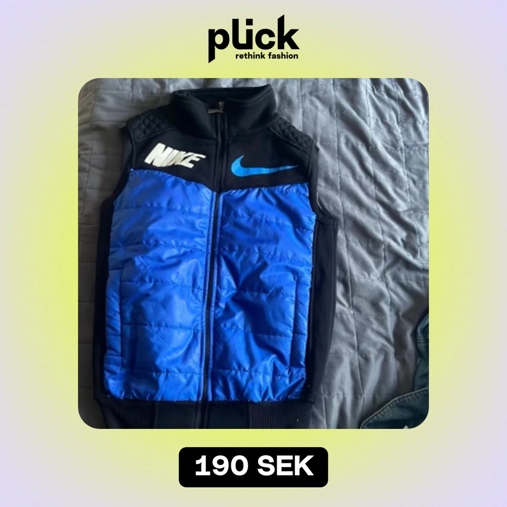 En blå och svart dunväst från Nike med dragkedja framtill. Västen har en hög krage och är dekorerad med Nike-logotypen i vitt och blått på framsidan samt en stor vit Nike-logotyp på baksidan.