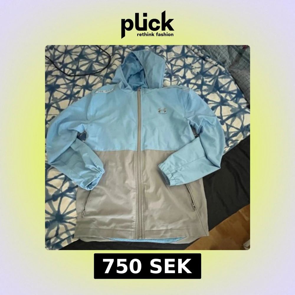 Säljer en snygg tvåfärgad vindjacka från Under Armour i ljusblått och grått. Jackan har huva, dragkedja framtill och två fickor med dragkedja. Perfekt för blåsiga dagar och enkel att matcha med det mesta.