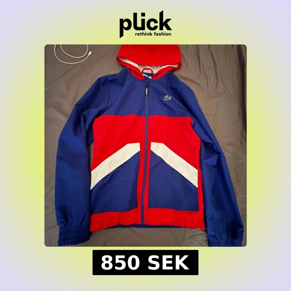 Snygg vindjacka från Lacoste i blått, rött och vitt med coola grafiska detaljer framtill. Jackan har huva, dragkedja och elastiska muddar. Perfekt för dig som gillar sportig stil och vill sticka ut med färg. Ikoniska Lacoste-loggan på bröstet.