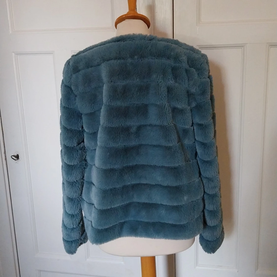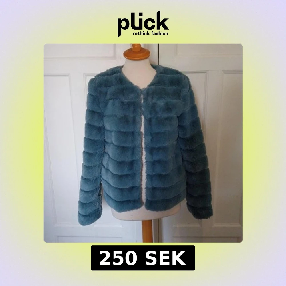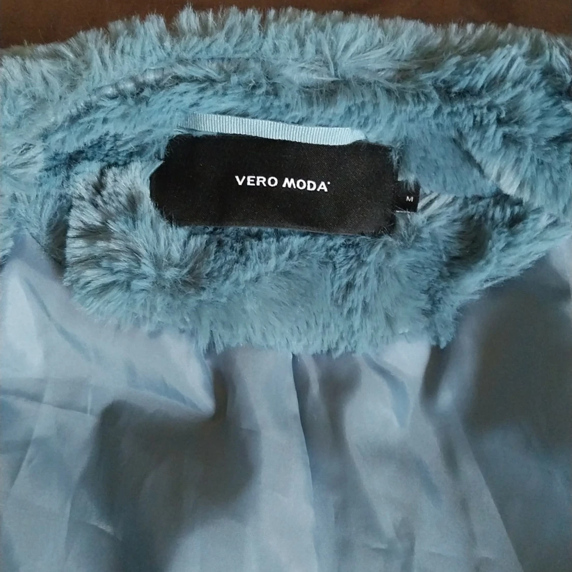 Säljer en fluffig blå pälsjacka från Vero Moda i storlek M. Jackan har lång ärm, rund halsringning och är sydd i breda, horisontella paneler för en cool look. Perfekt för dig som vill sticka ut med en mjuk och trendig jacka.