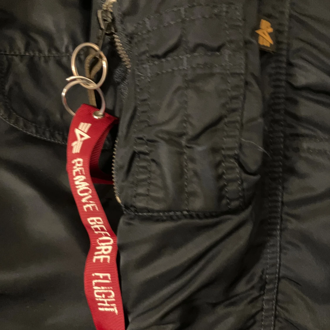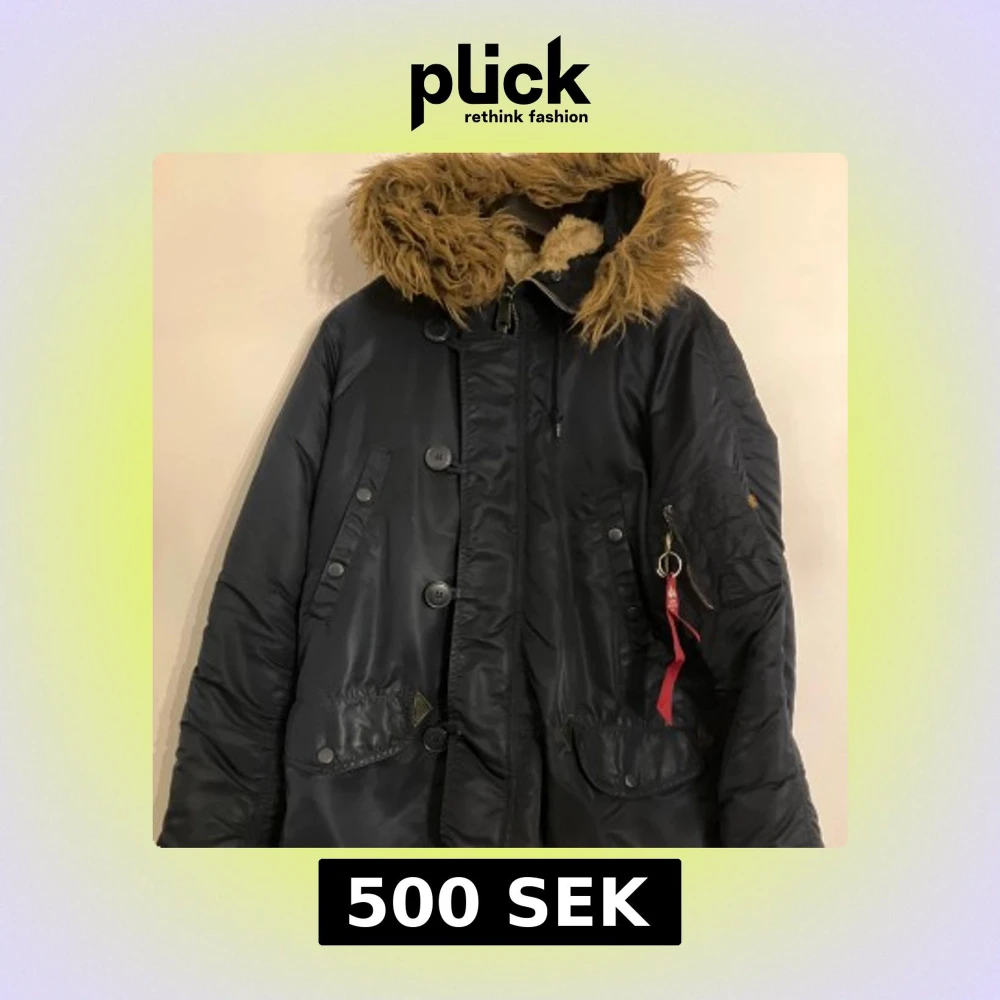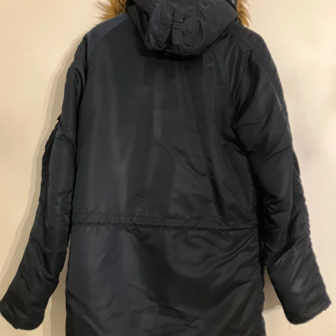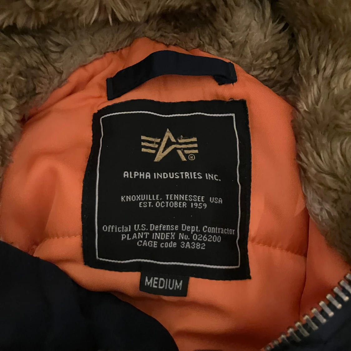Parkajacka från Alpha Industries i blått med fluffig brun fuskpäls på huvan och orange foder. Jackan har flera fickor, stora knappar, dragkedja och den klassiska 'Remove Before Flight'-taggen på ärmen. Perfekt för kalla dagar med sin rejäla och varma design.