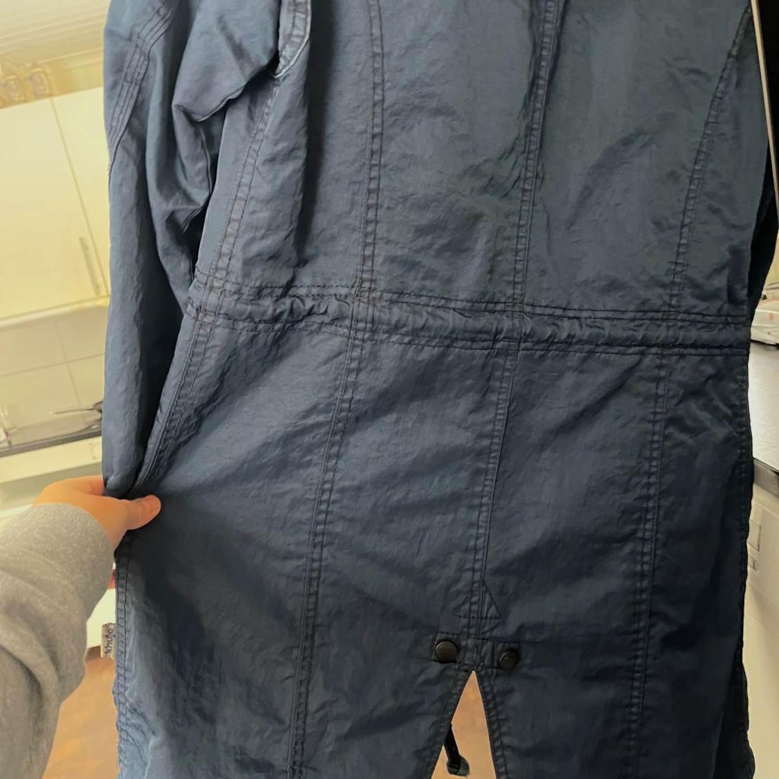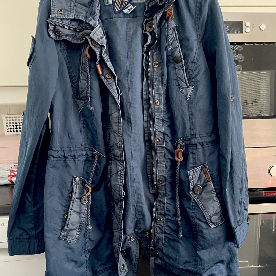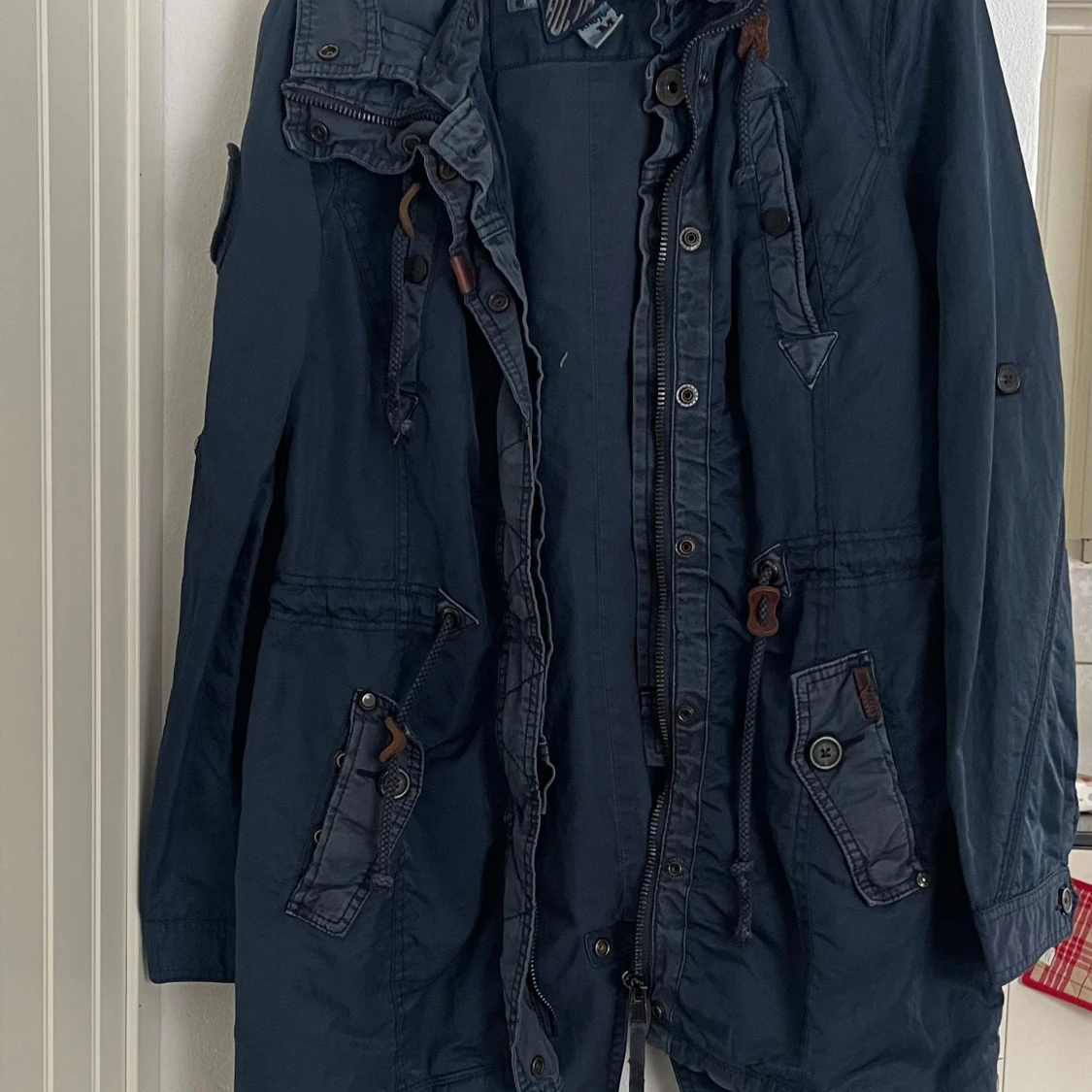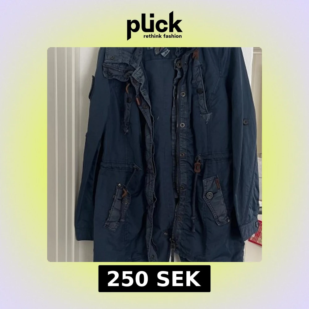 Säljer en blå parkajacka från khujo med dragkedja och knappar. Jackan har flera praktiska fickor och justerbar huva. Perfekt för kyligare dagar med sin långa ärm och stilrena design. Köptes på zalando för 1300 använd sällan.