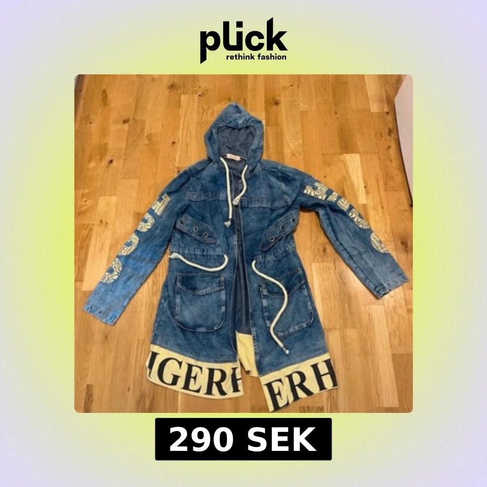 Unik blå parkajacka i jeansmaterial med huva, stora fickor och vita snören i midjan. Ärmarna har guldfärgade tryck och nederkanten har en bred beige kant med svart text. Perfekt statement-plagg för dig som vill sticka ut.
