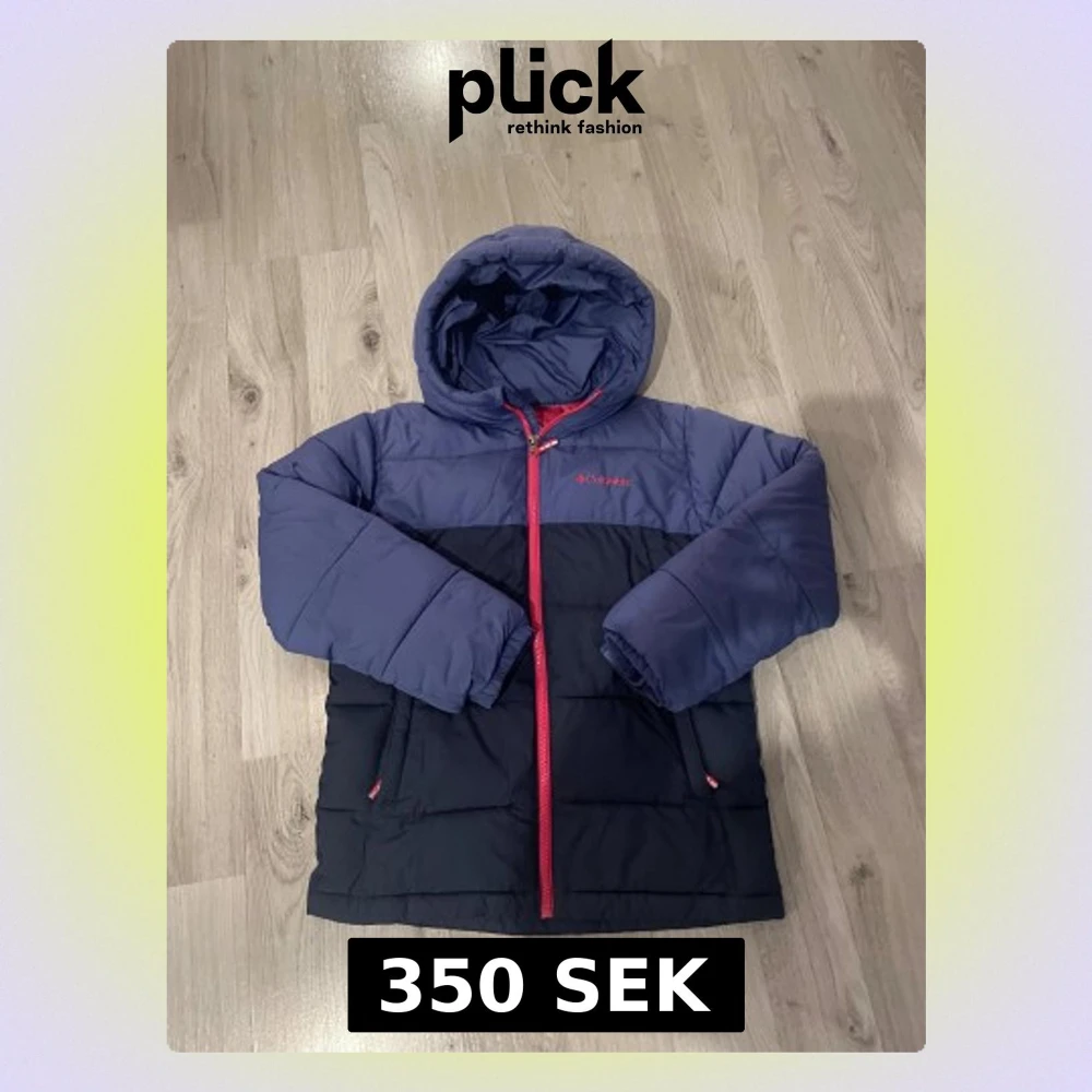 Blå och mörkblå pufferjacka från Columbia med huva och röda dragkedjedetaljer. Jackan har quiltad design, två fickor med dragkedja och logga på bröstet. Perfekt för kalla dagar och har en riktigt skön passform.