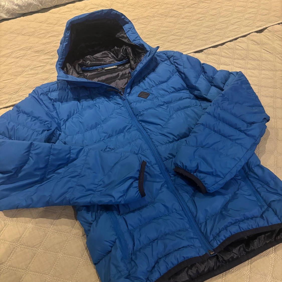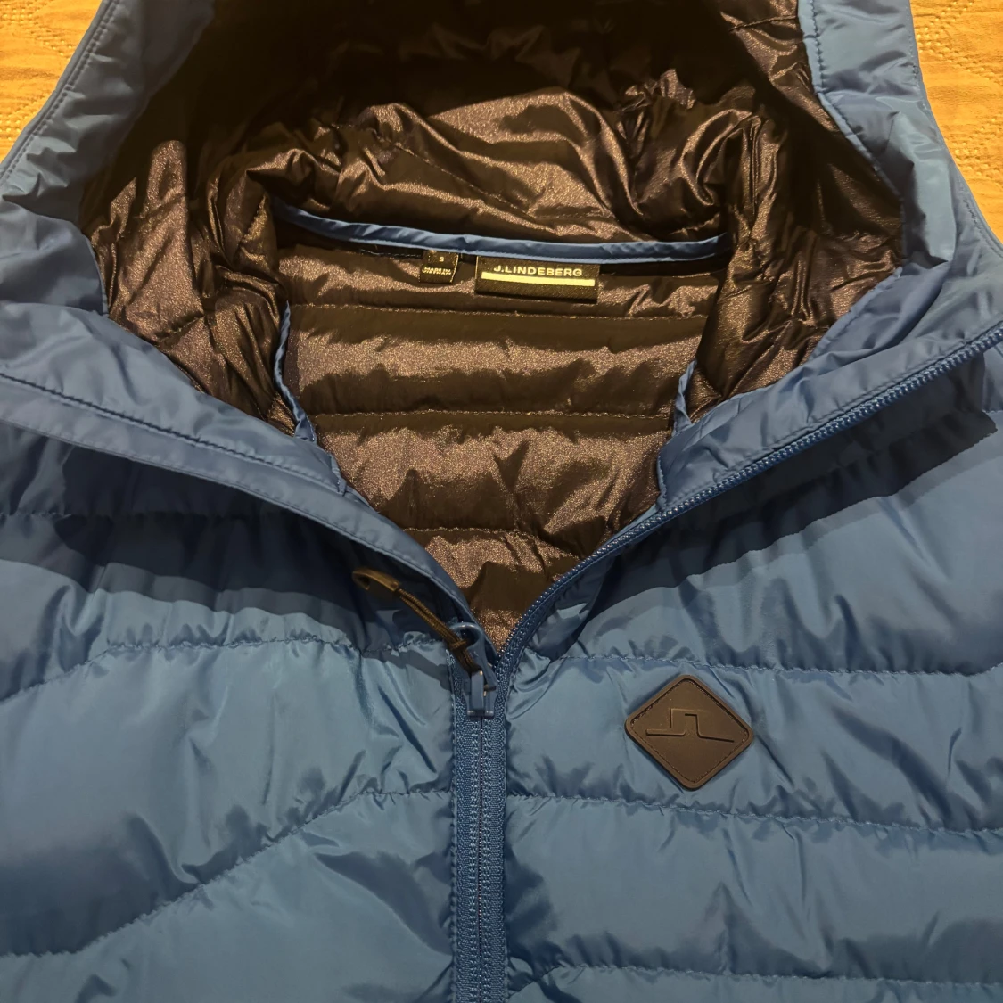 Snygg blå pufferjacka från J.Lindeberg med dragkedja och huva. Perfekt för kyliga dagar med sin quiltade design som håller värmen. Jackan har en stilren look med en diskret logga på bröstet.