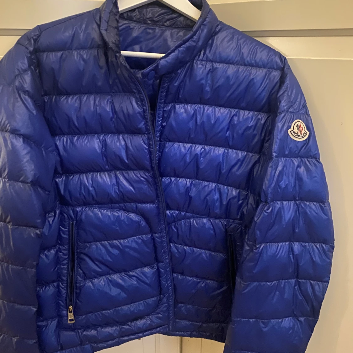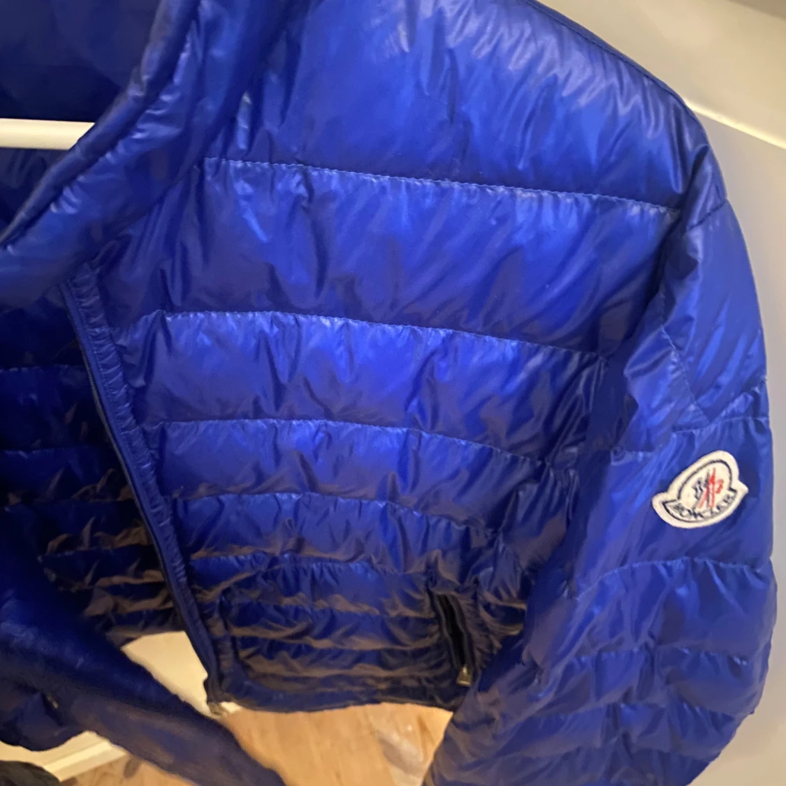 Säljer en blå pufferjacka från Moncler med quiltad design och dragkedja framtill. Jackan har lång ärm och klassisk Moncler-logga på ena ärmen. Perfekt för kyligare dagar.