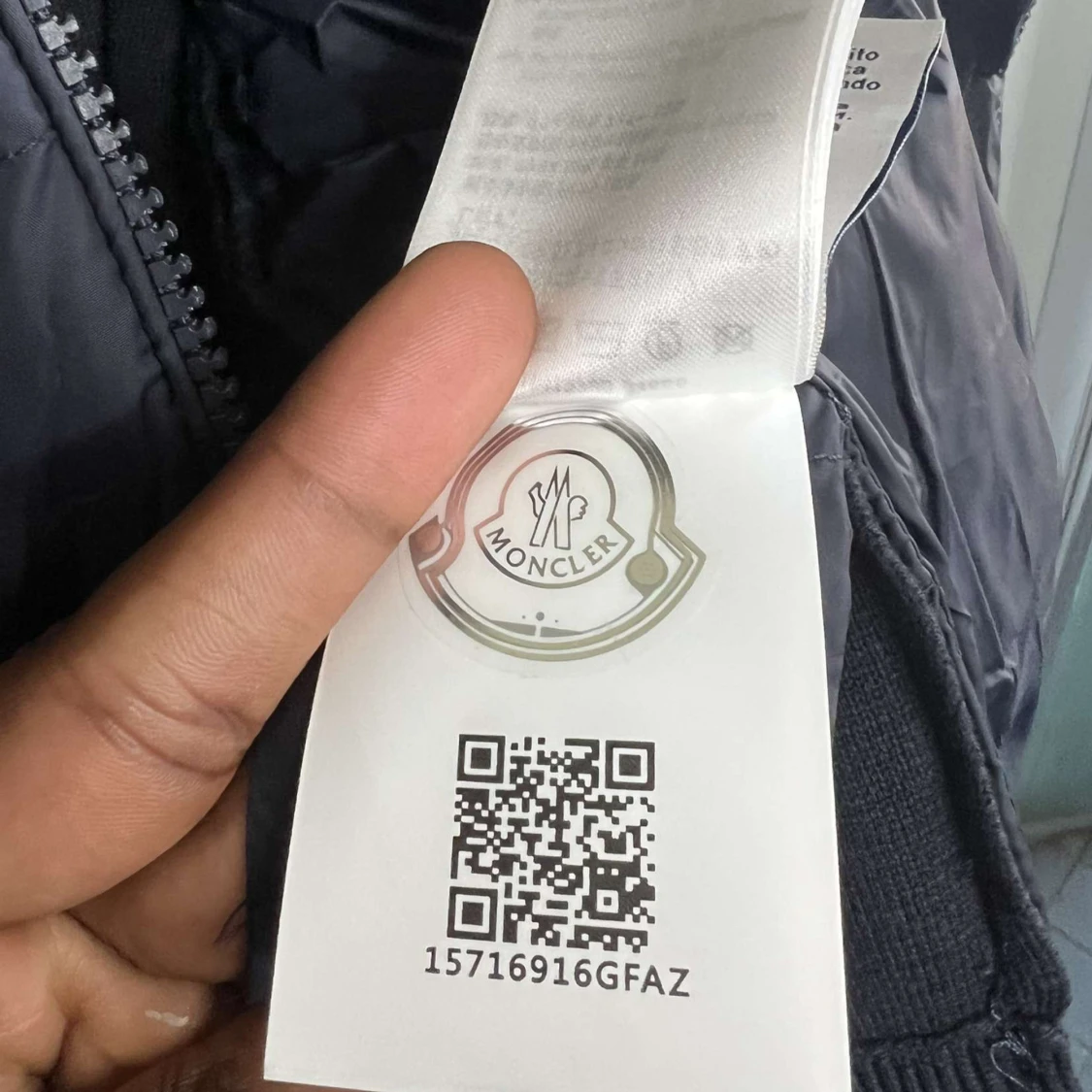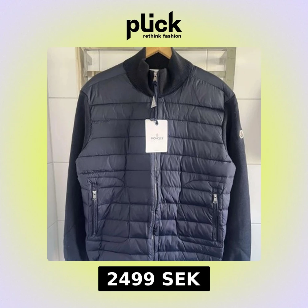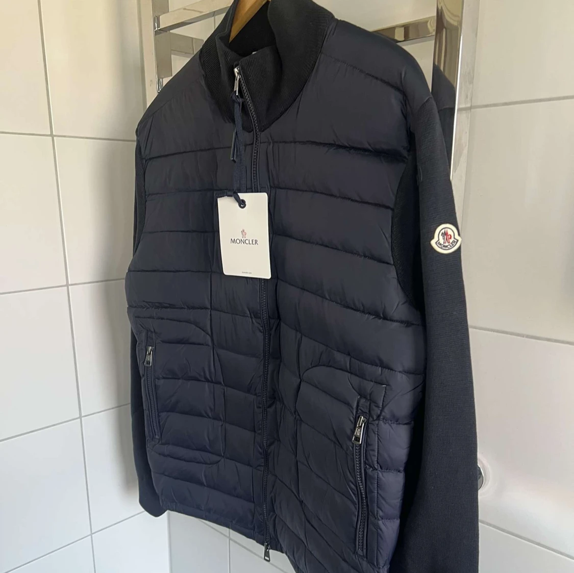 Snygg blå pufferjacka från Moncler med quiltad front och ärmar i stickad kvalitet. Jackan har dragkedja framtill, två fickor med dragkedja och Moncler-logga på ärmen. Perfekt för kyliga dagar. Oanvänd och kommer med kvitto.