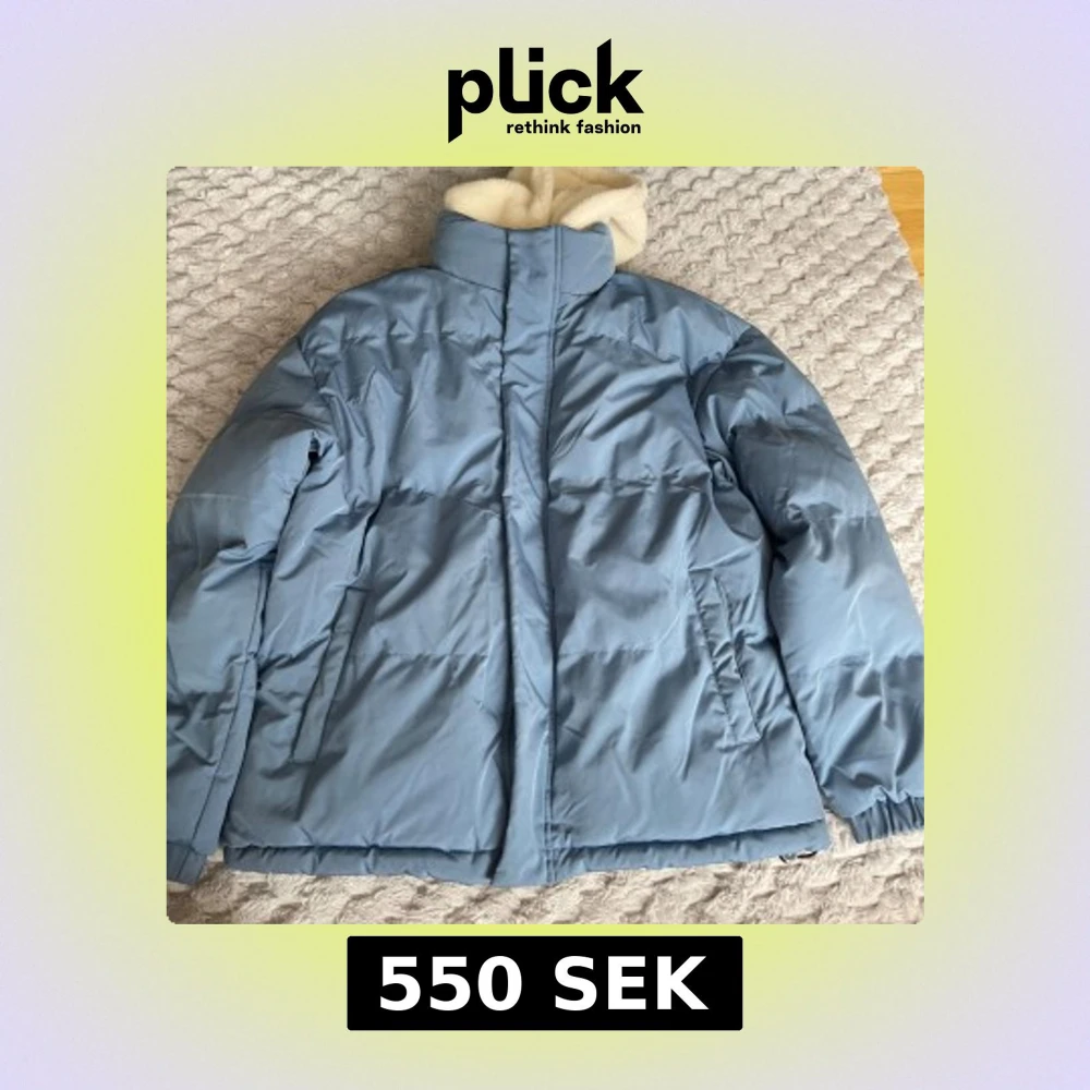 Säljer en snygg blå pufferjacka med mysigt vitt foder. Jackan har en hög krage och dragkedja framtill. Perfekt för kyliga dagar när du vill hålla dig varm och bekväm. Skulle säga att storleken är stor M. Priset går att diskutera!