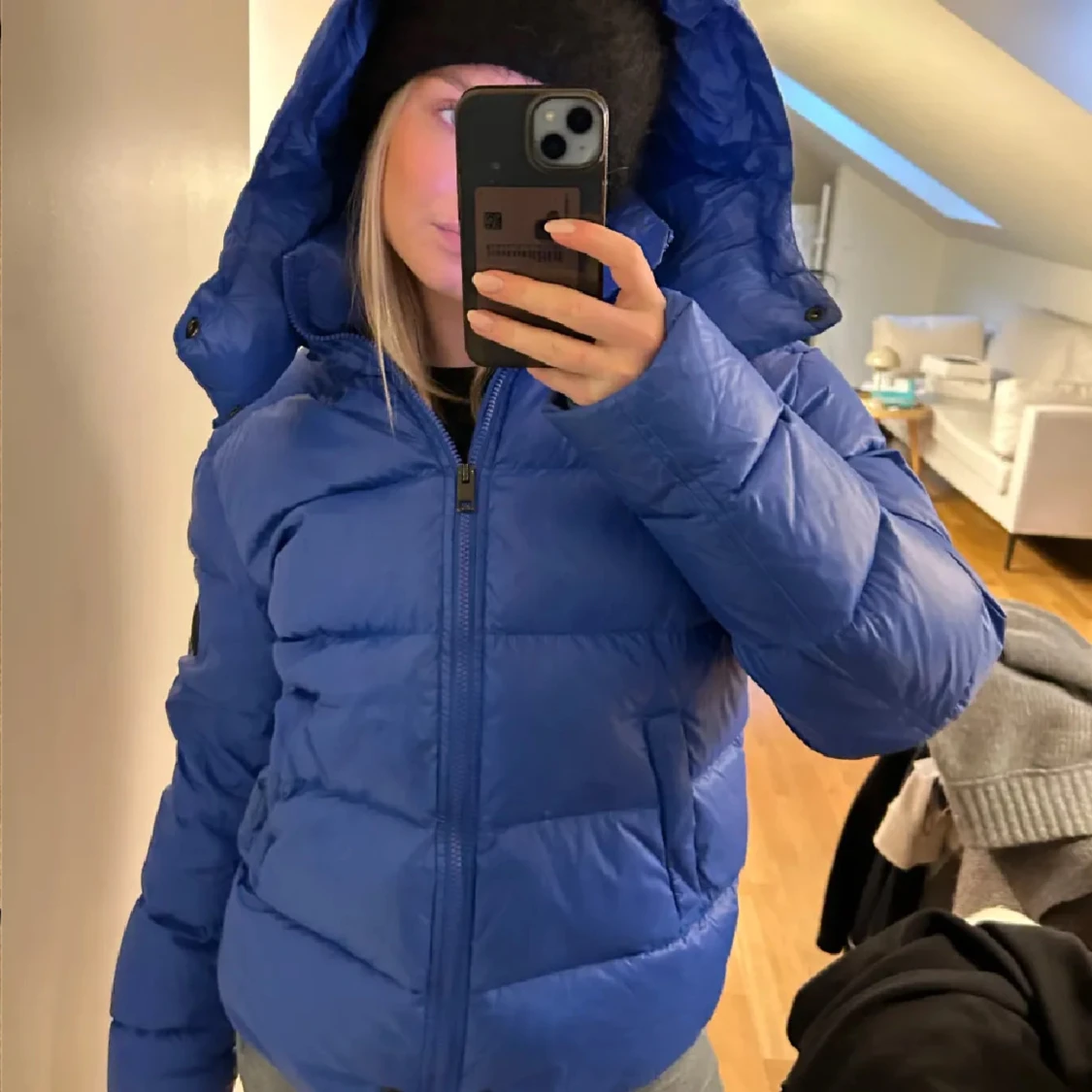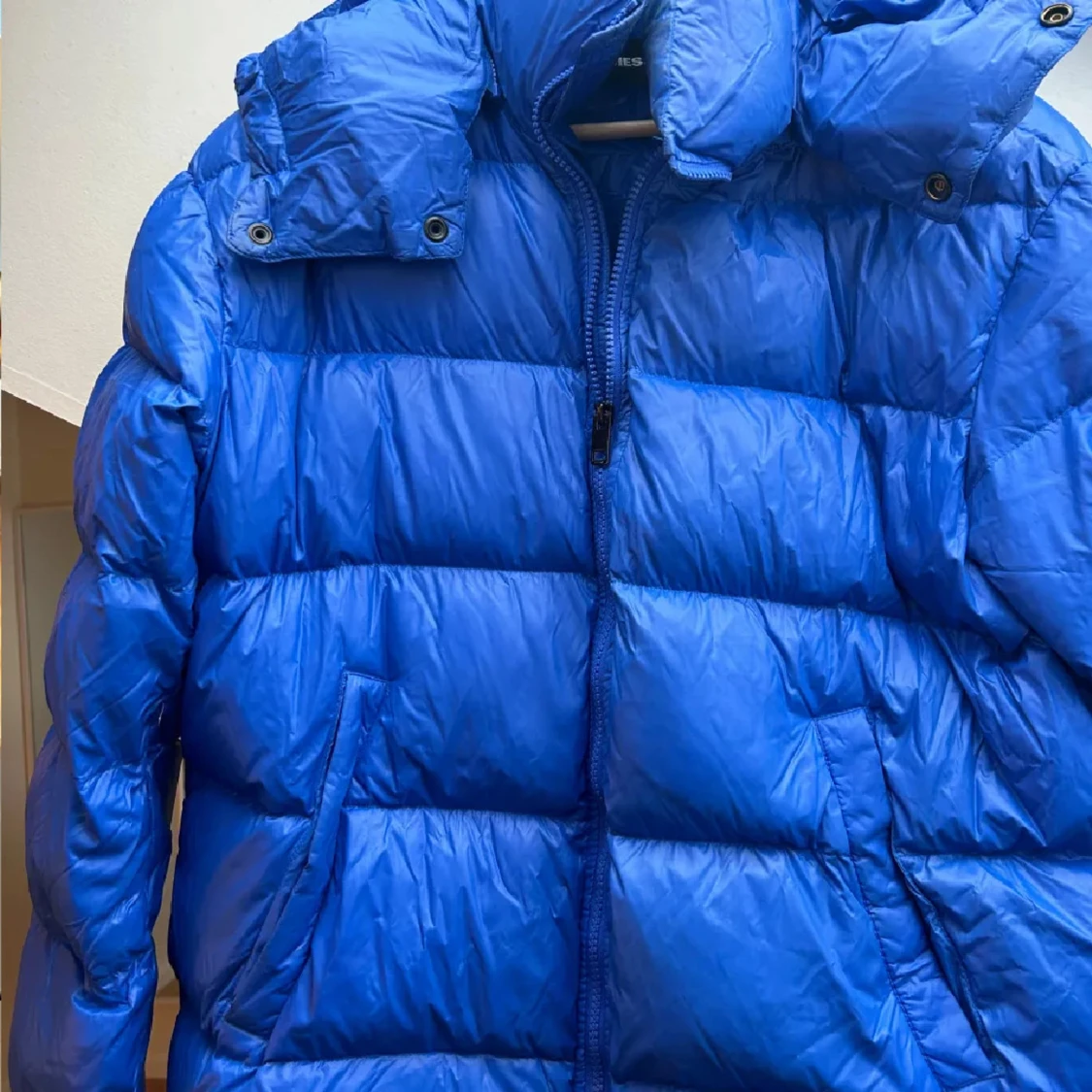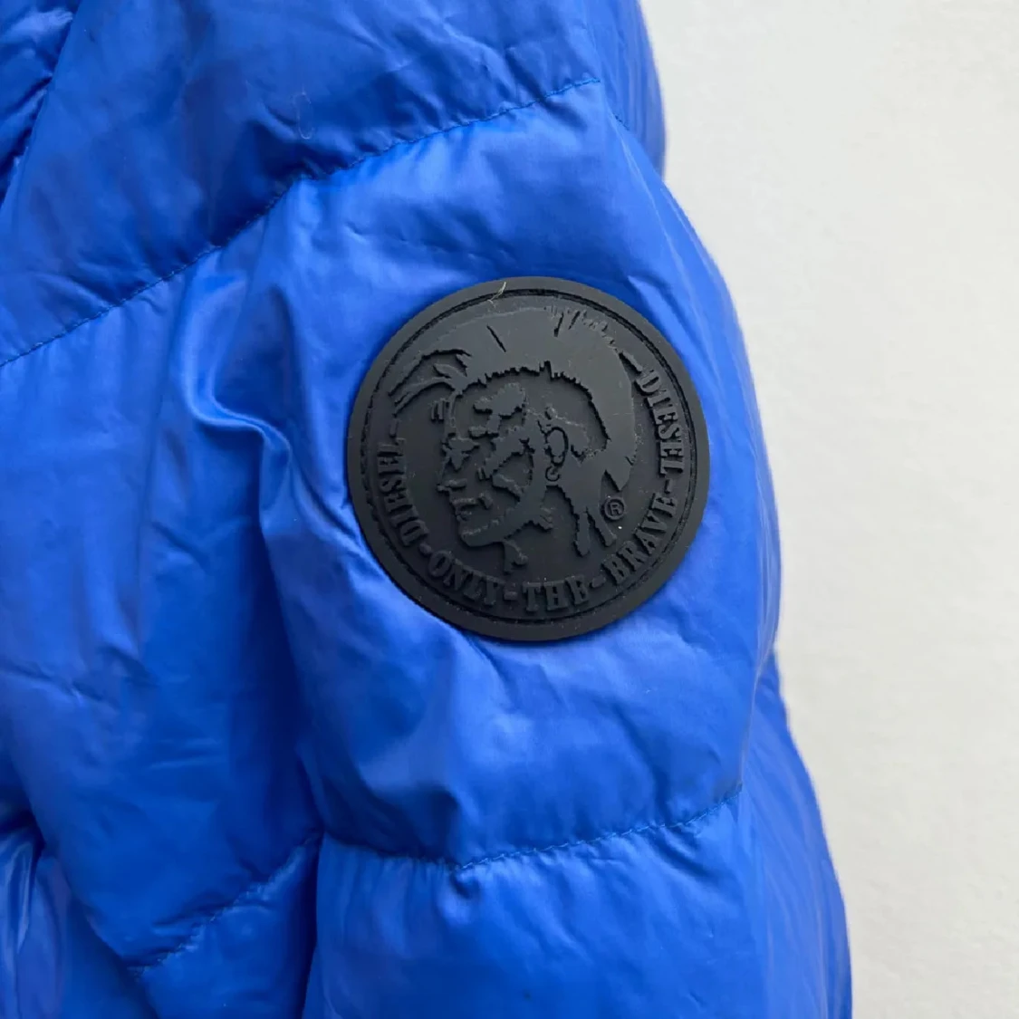 Säljer en blå pufferjacka från diesel med avtagbar huva och dragkedja framtill. Den passar både tjejer och killar. Jackan har en quiltad look, två sidofickor och långärmade ärmar. Perfekt för kalla dagar och har en riktigt schysst färg som sticker ut.