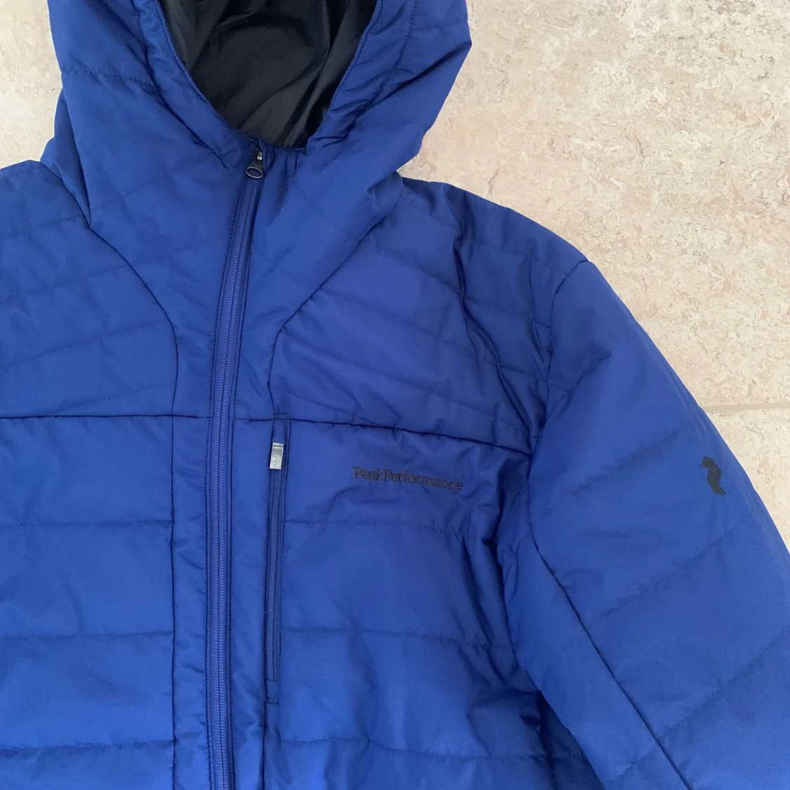 Blå pufferjacka från Peak Performance med huva och dragkedja framtill. Jackan har quiltad design, en bröstficka med dragkedja och diskret logga på bröstet. Perfekt för kalla dagar och riktigt snygg färg som sticker ut.