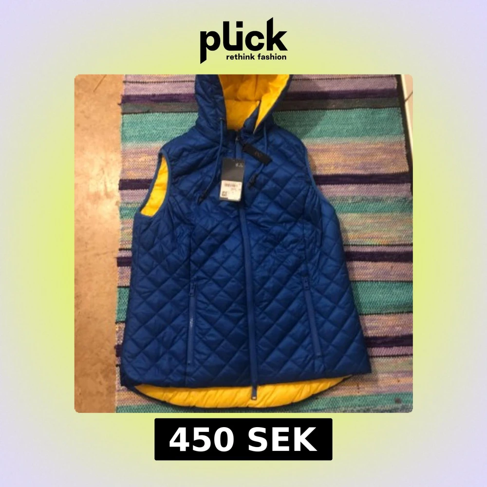 Quiltad blå dunväst från Laurason med gul insida och huva. Västen har dragkedja framtill, två fickor med dragkedja och justerbar dragsko vid huvan. Perfekt för lager-på-lager och ger en sportig vibe. Den är storlek M.