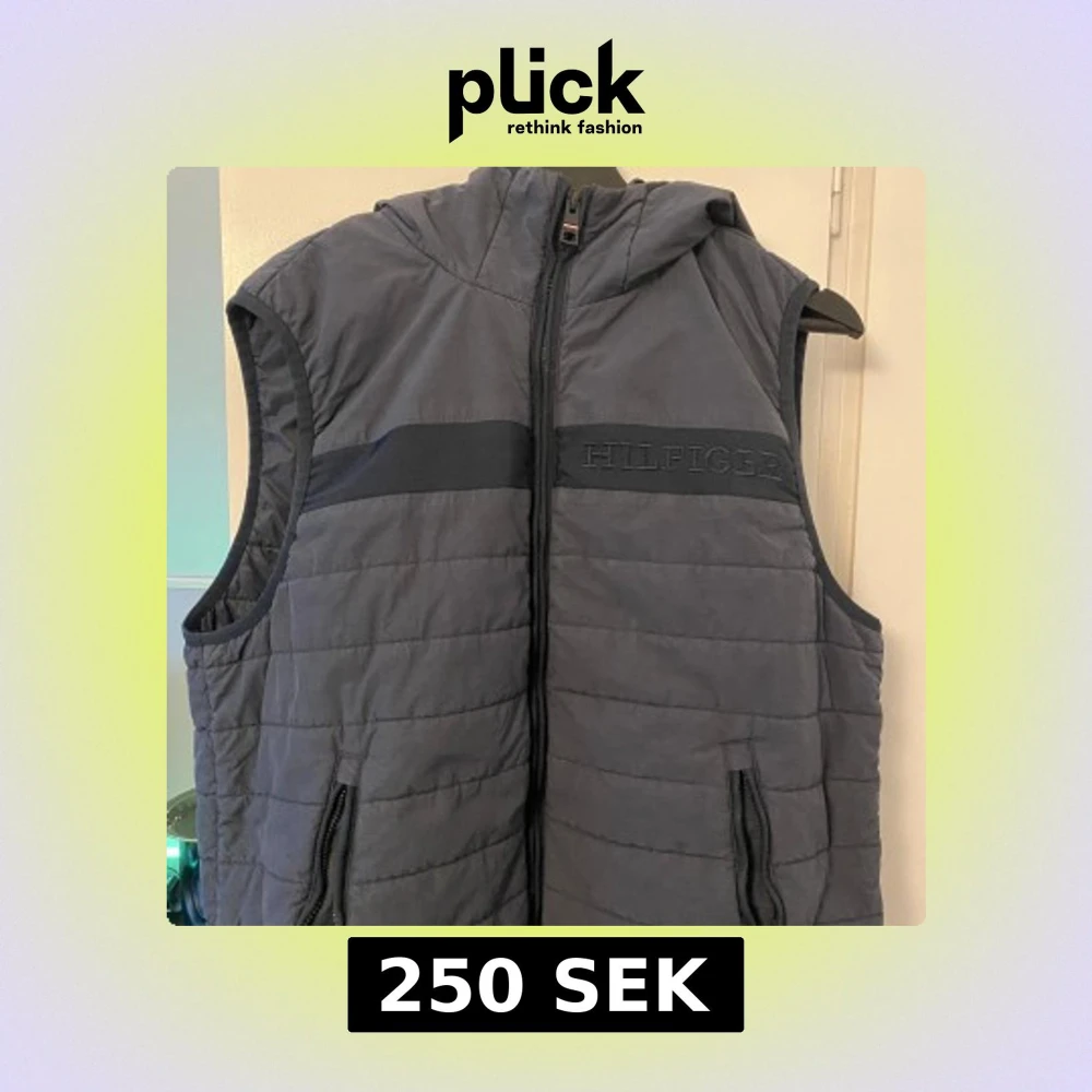 Säljer en blå quiltad väst från Tommy Hilfiger med dragkedja och huva. Västen har två praktiska fickor med dragkedjor och ett diskret märke på bröstet. Perfekt för våren!
