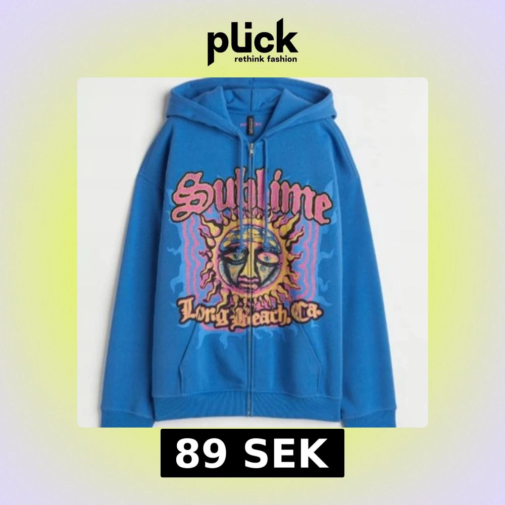 Säljer en blå hoodie från H&M med Sublime-tryck och färgglad grafik på framsidan. Tröjan har huva, dragkedja och långa ärmar.