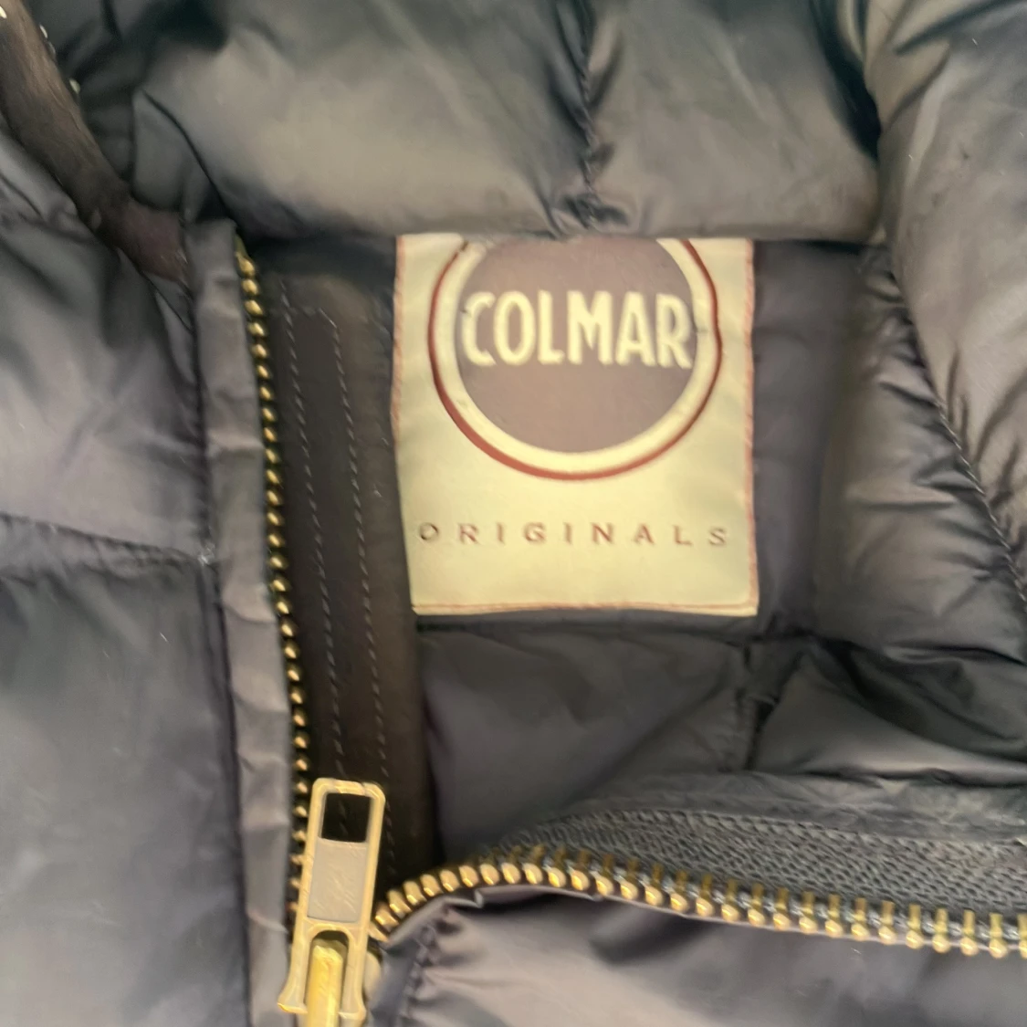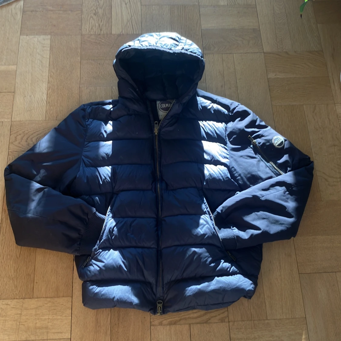 Säljer en snygg blå/svart pufferjacka från Colmar. Jackan har en dragkedja framtill och en praktisk huva. Perfekt för kyligare dagar med sin vadderade design som håller dig varm. Märkeslogga på ärmen ger en extra touch av stil. Storlek 48 som passar ca S