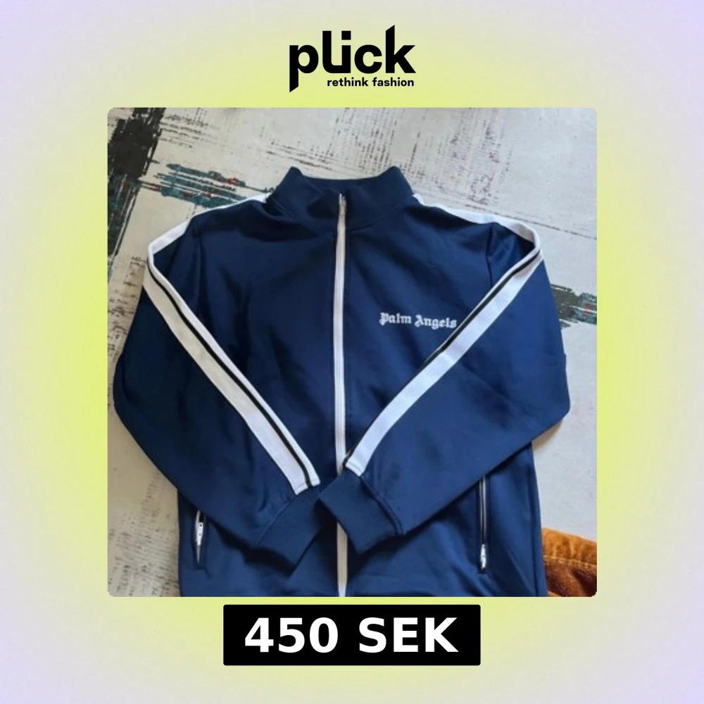Snygg marinblå track jacket från Palm Angels med vita och svarta ränder längs ärmarna. Jackan har hög krage, hel dragkedja framtill och fickor med dragkedja. Perfekt för en sportig och trendig look.
