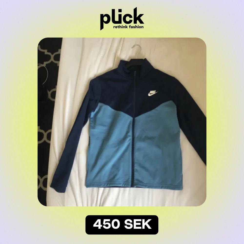 Säljer en snygg blå träningsjacka från Nike. Den har en dragkedja framtill och är långärmad. Perfekt för träning eller en avslappnad stil. Jackan är i bra skick och har en stilren design med Nike-loggan på bröstet.