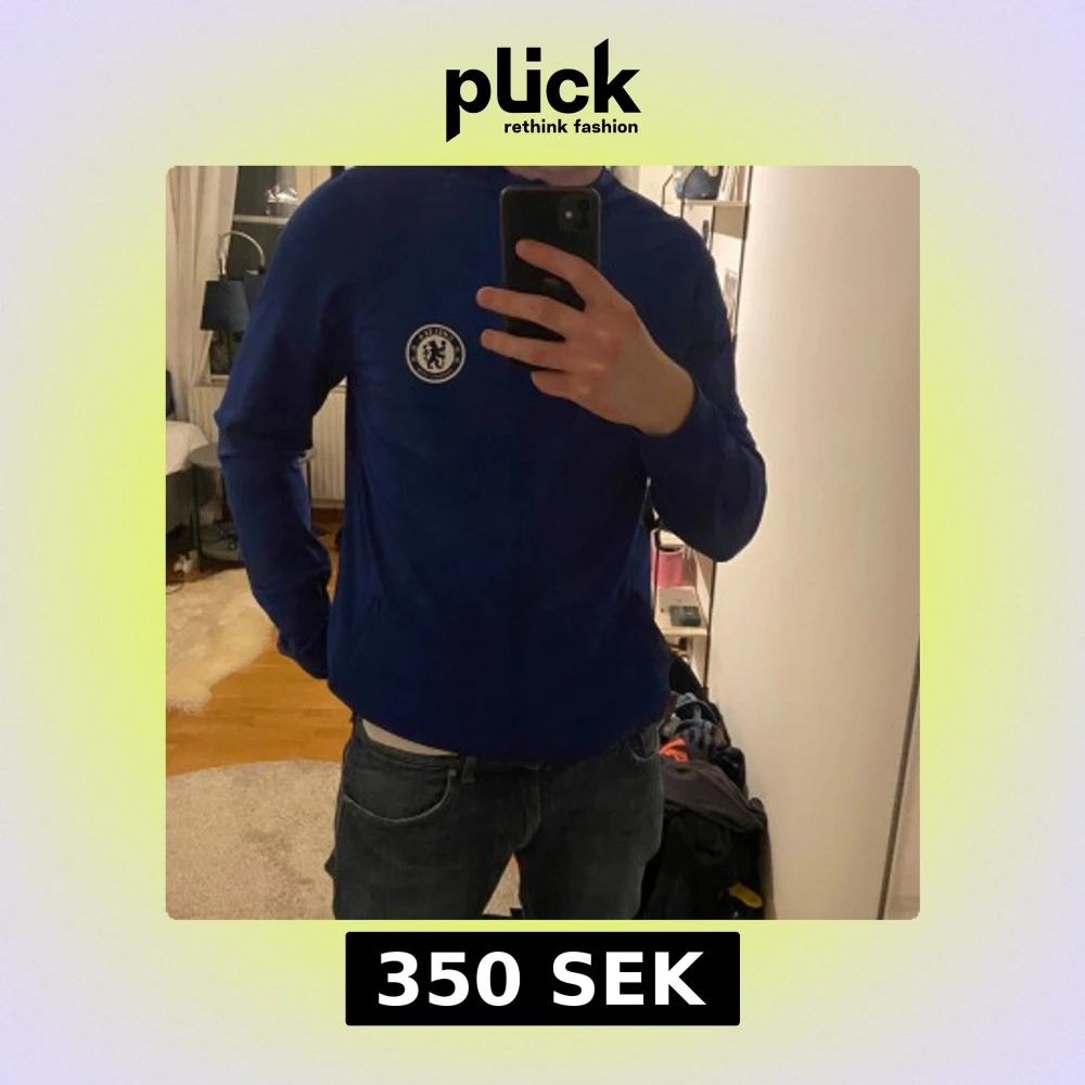 Säljer en blå träningsjacka från Nike med Chelsea FC-logga på bröstet. Jackan har dragkedja och långa ärmar, perfekt för fotbollsträning eller vardagsbruk.
