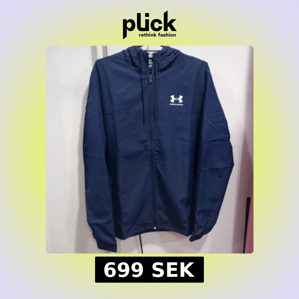 Snygg marinblå vindjacka från Under Armour med huva och dragkedja framtill. Jackan har meshfoder, två fickor med dragkedja och logga på bröstet. Perfekt för träning eller när du vill ha en sportig look.