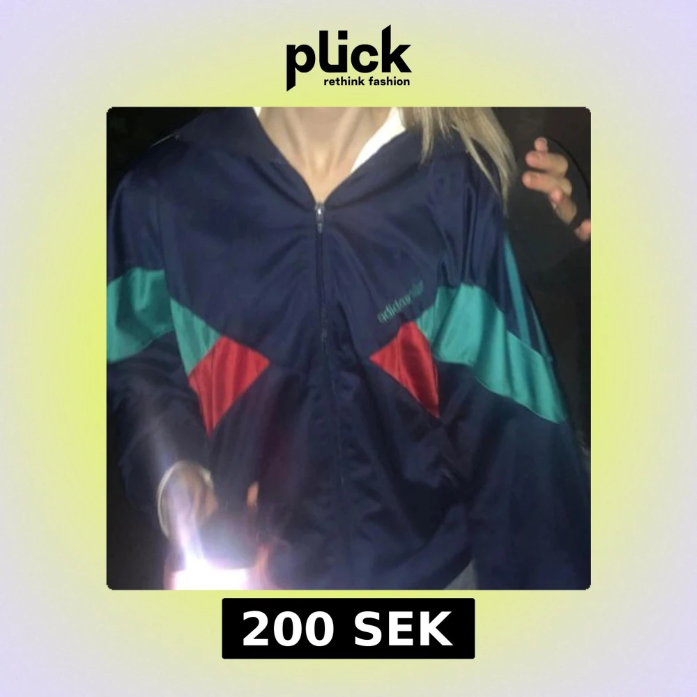 Säljer en blå vindjacka från Adidas med dragkedja och färgglada detaljer i rött och grönt. Bra kvalitet